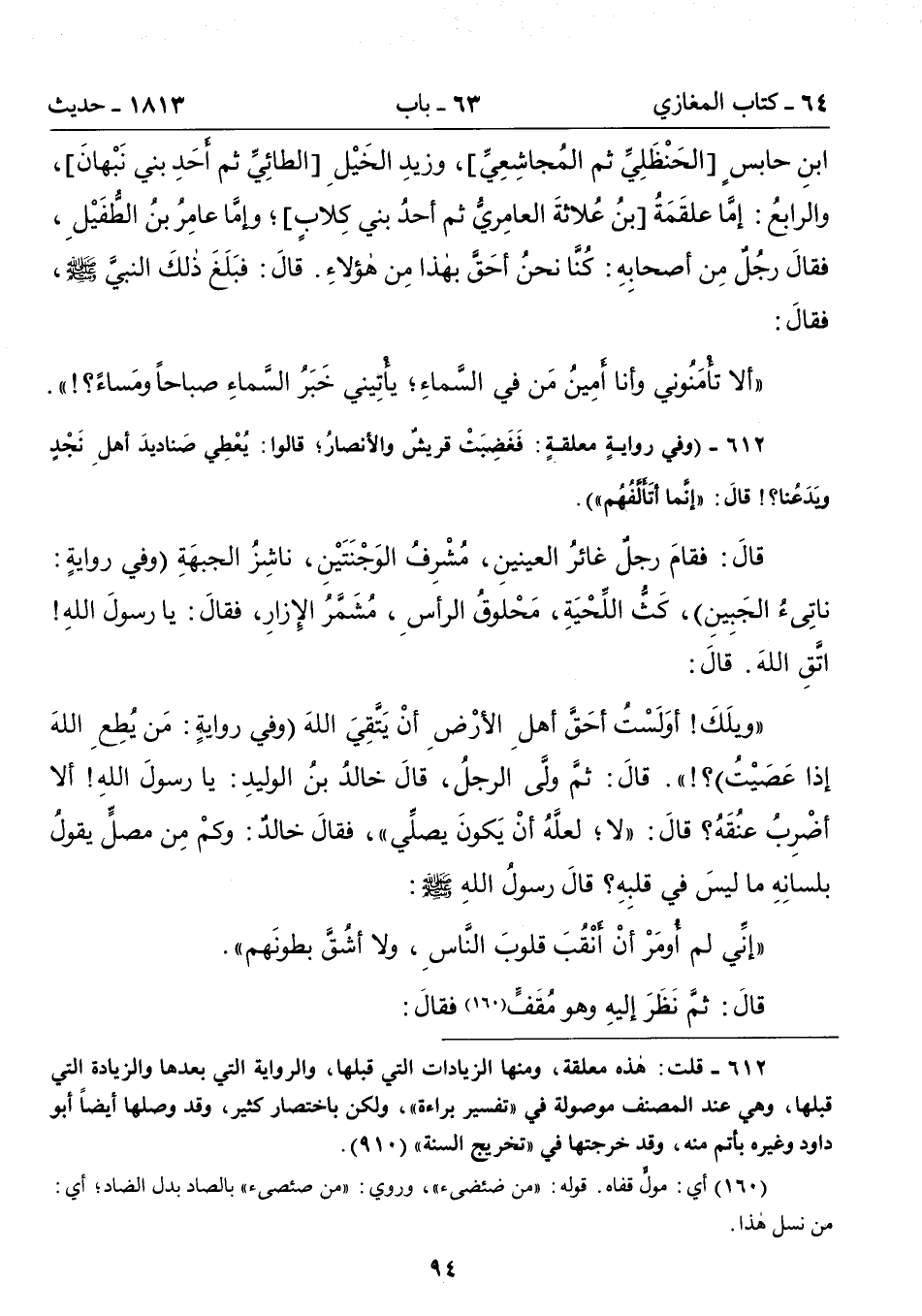 612 - (وفي روايةٍ معلقةٍ: فَغَضِبَتْ قُرَيْشٌ وَالأَنْصَارُ؛ قَالُوا يُعْطِى صَنَادِيدَ أَهْلِ نَجْدٍ وَيَدَعُنَا؟! قَالَ: «إِنَّمَا أَتَأَلَّفُهُمْ").