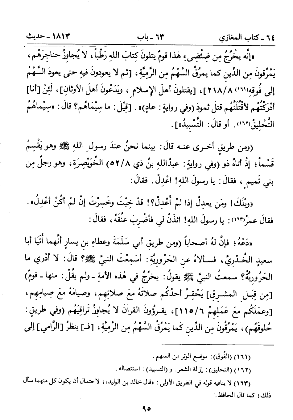 "إِنَّهُ يَخْرُجُ مِنْ ضِئْضِئِ هَذَا قَوْمٌ يَتْلُونَ كِتَابَ اللَّهِ رَطْبًا، لاَ يُجَاوِزُ حَنَاجِرَهُمْ، يَمْرُقُونَ مِنَ الدِّينِ كَمَا يَمْرُقُ السَّهْمُ مِنَ الرَّمِيَّةِ، [ثُمَّ لاَ يَعُودُونَ فِيهِ حَتَّى يَعُودَ السَّهْمُ إِلَى فُوقِهِ (161) 8/ 218] [يَقْتُلُونَ أَهْلَ الإِسْلاَمِ، وَيَدَعُونَ أَهْلَ الأَوْثَانِ]، لَئِنْ [أَنَا] أَدْرَكْتُهُمْ لأَقْتُلَنَّهُمْ قَتْلَ ثمودَ (وفى روايةٍ: عَادٍ)]. [قِيلَ: مَا سِيمَاهُمْ؟ قَالَ: «سِيمَاهُمُ التَّحْلِيقُ (162). أَوْ قَالَ: التَّسْبِيدُ»].