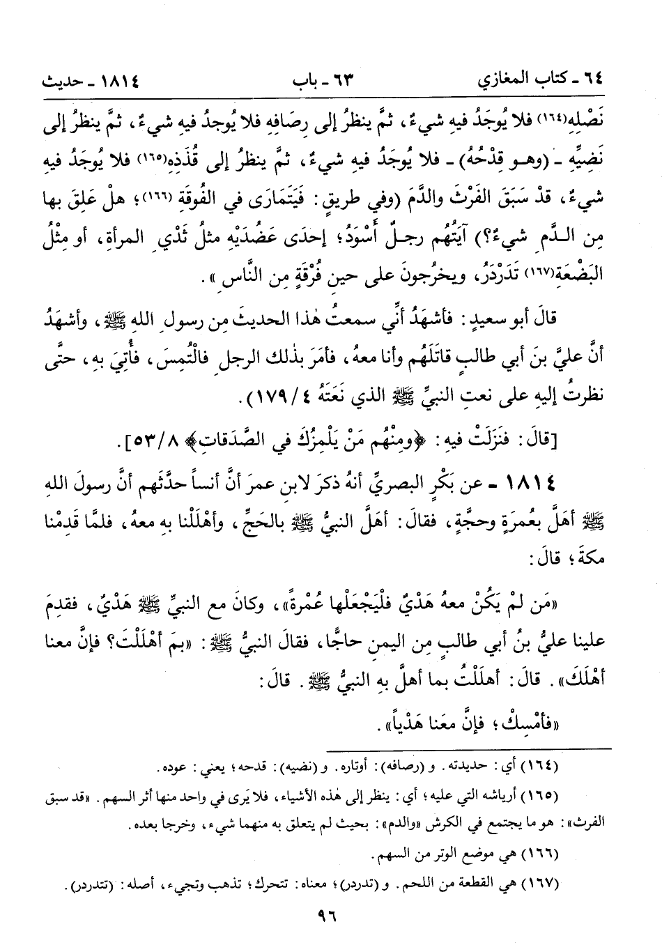 نَصْلِهِ (164) فَلاَ يُوجَدُ فِيهِ شَىْءٌ، ثُمَّ يُنْظَرُ إِلَى رِصَافِهِ فَلا يُوجَدُ فِيهِ شَىْءٌ، ثُمَّ يُنْظَرُ إِلَى نَضِيِّهِ - (وَهْوَ قِدْحُهُ) - فَلاَ يُوجَدُ فِيهِ شَىْءٌ، ثُمَّ يُنْظَرُ إِلَى قُذَذِهِ (165) فَلاَ يُوجَدُ فِيهِ شَىْءٌ، قَدْ سَبَقَ الْفَرْثَ وَالدَّمَ (وفى طريق: فَيَتَمَارَى فى الفُوقَة (166)؛ هلْ عَلِقَ بها مِن الدَّمِ شئً؟) آيَتُهُمْ رَجُلٌ أَسْوَدُ؛ إِحْدَى عَضُدَيْهِ مِثْلُ ثَدْىِ الْمَرْأَةِ، أَوْ مِثْلُ الْبَضْعَةِ (167) تَدَرْدَرُ , وَيَخْرُجُونَ عَلَى حِينِ فُرْقَةٍ مِنَ النَّاسِ".