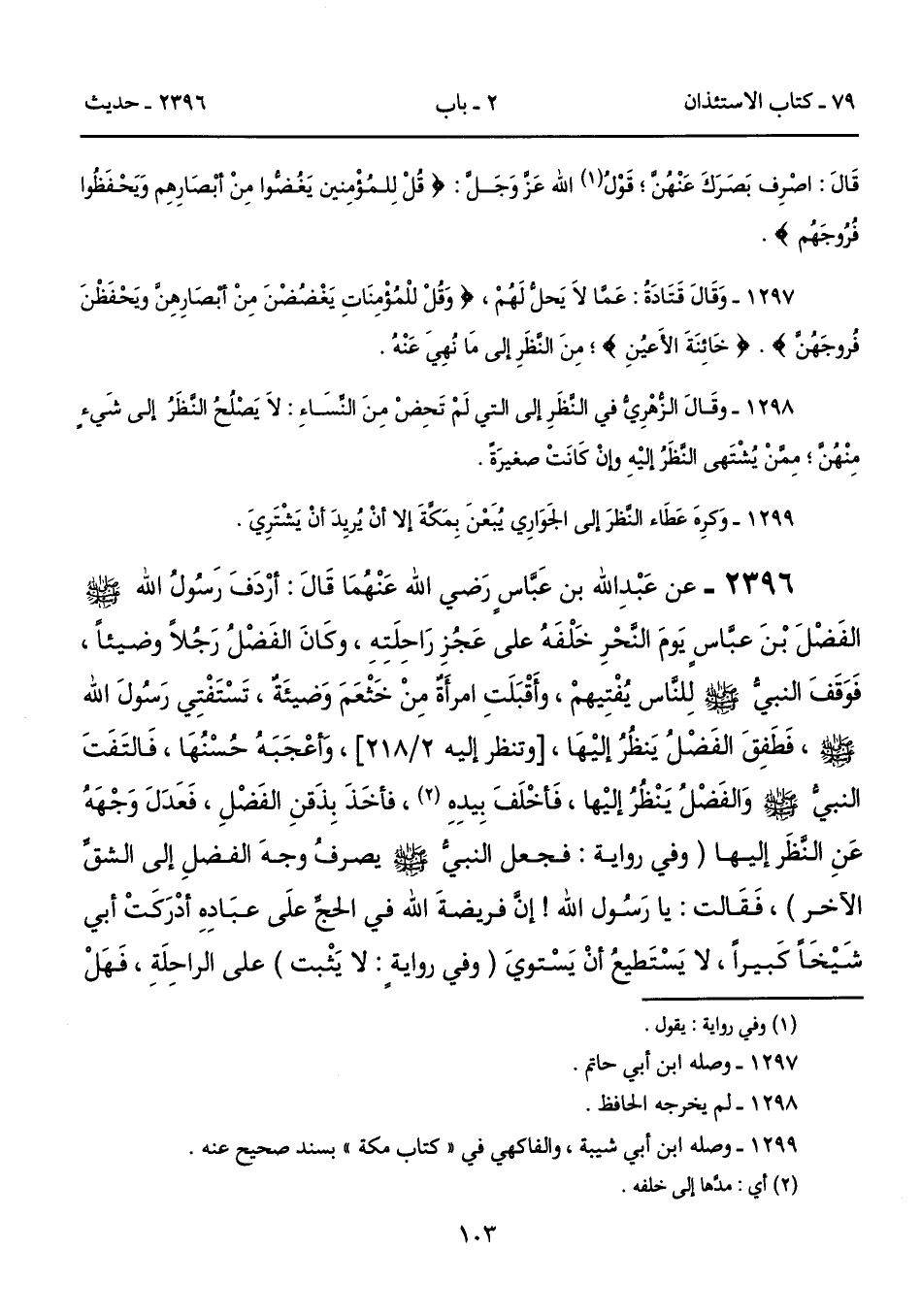 2396 - عن عَبْدِ اللَّهِ بْنُ عَبَّاسٍ - رضى الله عنهما - قَالَ: أَرْدَفَ رَسُولُ اللَّهِ - صلى الله عليه وسلم - الْفَضْلَ بْنَ عَبَّاسٍ يَوْمَ النَّحْرِ خَلْفَهُ عَلَى عَجُزِ رَاحِلَتِهِ، وَكَانَ الْفَضْلُ رَجُلاً وَضِيئًا، فَوَقَفَ النَّبِيُّ - صلى الله عليه وسلم - لِلنَّاسِ يُفْتِيهِمْ، وَأَقْبَلَتِ امْرَأَةٌ مِنْ خَثْعَمَ وَضِيئَةٌ، تَسْتَفْتِى رَسُولَ اللَّهِ - صلى الله عليه وسلم -، فَطَفِقَ الْفَضْلُ يَنْظُرُ إِلَيْهَا، [وتنظر إليه 2/ 218]، وَأَعْجَبَهُ حُسْنُهَا، فَالْتَفَتَ النَّبِيُّ - صلى الله عليه وسلم - وَالفَضْلُ يَنْظُرُ إِلَيْهَا، فَأَخْلَفَ بِيَدِهِ (2)، فَأَخَذَ بِذَقَنِ الْفَضْلِ، فَعَدَلَ وَجْهَهُ عَنِ النَّظَرِ إِلَيْهَا (وفي روايةٍ: فجعل النبيُّ - صلى الله عليه وسلم - يصرفُ وجهَ الفضلِ إلى الشقِّ الآخر)، فَقَالَتْ: يَا رَسُولَ اللَّهِ! إِنَّ فَرِيضَةَ اللَّهِ فِى الْحَجِّ عَلَى عِبَادِهِ أَدْرَكَتْ أَبِى شَيْخًا كَبِيرًا، لَا يَسْتَطِيعُ أَنْ يَسْتَوِىَ (وفي روايةٍ: لا يَثْبت) عَلَى الرَّاحِلَةِ، فَهَلْ