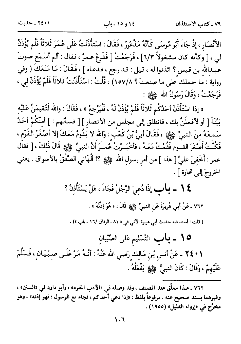 "إذا اسْتَأْذَنَ أحَدُكُم ثَلاثًا فَلَمْ يُؤْذَنْ لَهُ، فَلْيَرْجعْ"، فَقَالَ: والله لَتُقيمَنَّ عَليْهِ بَيِّنَةً [أو لأفعلَنَّ بك، فانطلق إلى مجلسٍ من الأنصارِ] [فسألهم:] أمِنْكُمْ أحَدٌ سَمِعَهُ مِنَ النبيِّ - صلى الله عليه وسلم -، فَقَالَ أبي بْنُ كَعْبٍ: وَاللهِ لا يَقُومُ مَعَكَ إلا أصْغَرُ القَوْمِ، فَكُنْتُ أَصْغَرَ القوم فقُمْتُ مَعَهُ، فأخْبَرْتُ عُمَرَ أَنَّ النبيَّ - صلى الله عليه وسلم - قَالَ ذَلِكَ، [فقال عمر: أَخَفِيَ عليَّ [هذا] من أمرِ رسولِ الله - صلى الله عليه وسلم -؟! ألْهَاني الصَّفْقُ بالأسواق. يعني الخروجَ إلى تجارة].