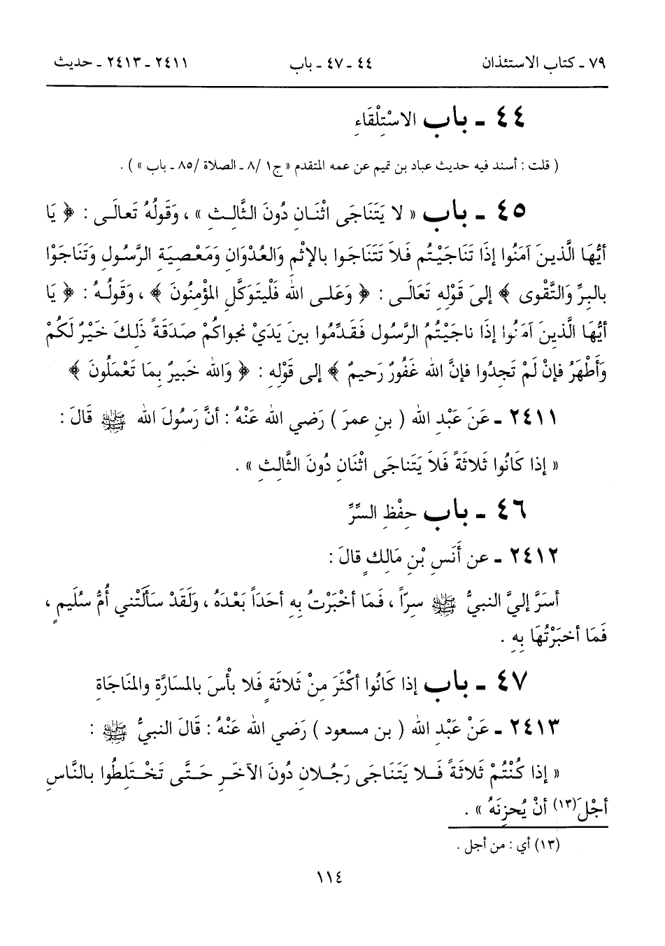 45 - باب "لا يَتَنَاجَى اثْنَانِ دُونَ الثَّالِثِ"، وَقَولُهُ تَعالَى: {يَا أَيُّهَا الَّذِينَ آمَنُوا إِذَا تَنَاجَيْتُمْ فَلَا تَتَنَاجَوْا بِالْإِثْمِ وَالْعُدْوَانِ وَمَعْصِيَتِ الرَّسُولِ وَتَنَاجَوْا بِالْبِرِّ وَالتَّقْوَى} إلىَ قَوْلِهِ تَعَالَى: (وَعَلى اللهِ فَلْيتَوَكَّلِ المؤْمِنُونَ)، وَقَولُهُ: {يَا أَيُّهَا الَّذِينَ آمَنُوا إِذَا نَاجَيْتُمُ الرَّسُولَ فَقَدِّمُوا بَيْنَ يَدَيْ نَجْوَاكُمْ صَدَقَةً ذَلِكَ خَيْرٌ لَكُمْ وَأَطْهَرُ فَإِنْ لَمْ تَجِدُوا فَإِنَّ اللَّهَ غَفُورٌ رَحِيمٌ} إلى قَوْلِهِ: (وَالله خَبيرٌ بِمَا تَعْمَلُونَ)