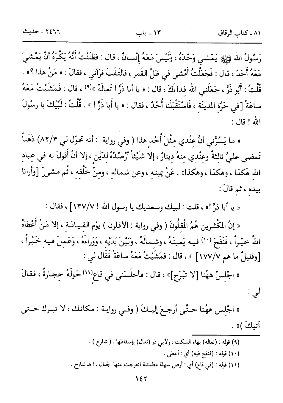 رَسُولُ الله - صلى الله عليه وسلم - يَمْشي وَحْدَهُ، وَلَيْسَ مَعَهُ إِنْسانٌ، قال: فظنَنْتُ أَنَّهُ يَكْرَهُ أنْ يَمْشيَ مَعَهُ أَحَدٌ، قال: فَجَعَلْتُ أَمْشي في ظلِّ القَمر، فالتَفَتَ فرَآني، فقالَ: "مَنْ هذا؟ ". قُلْتُ: أَبُو ذرٍّ، جَعَلَني الله فِداءَكَ، قال: "يا أبا ذرٍّ تَعالَهْ" (9)، قال: فَمَشَيْتُ مَعَهُ ساعَةً [في حَرَّةِ المدينَةِ، فَاسْتَقْبَلَنا أُحُدٌ، فقال: "يا أَبا ذَرٍّ! ". قُلْتُ: لَبِّيْكَ يا رسُولَ الله! قال: