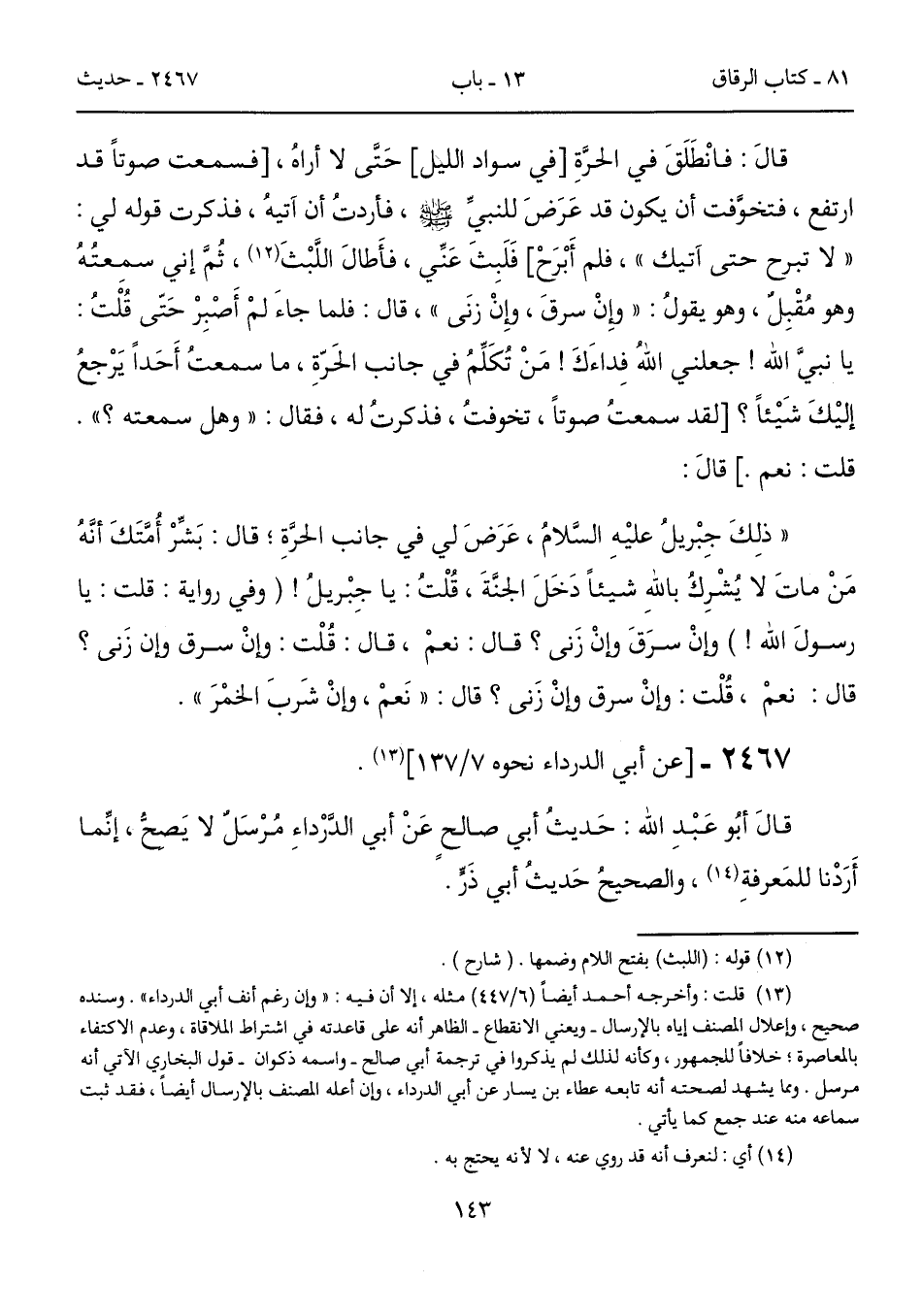 قالَ أبُو عَبْدِ الله: حَديثُ أبي صالحٍ عَنْ أبي الدَّرْداءِ مُرْسَلٌ لا يَصحُّ، إنِّما أَرَدْنا للمَعرفةِ (14)، والصحيحُ حَديثُ أبي ذَرٍّ.