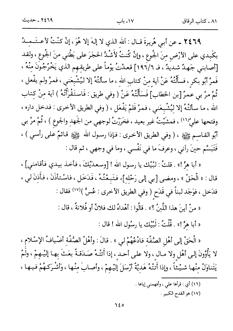 2469 - عن أبي هُرَيْرَةَ كَانَ يَقُولُ: آللَّهِ الَّذِى لَا إِلَهَ إِلاَّ هُوَ، إِنْ كُنْتُ لأَعْتَمِدُ بِكَبِدِي عَلَى الأَرْضِ مِنَ الْجُوعِ، وَإِنْ كُنْتُ لأَشُدُّ الْحَجَرَ عَلَى بَطْنِي مِنَ الْجُوعِ، وَلَقَدْ [أصابني جَهدٌ شديدٌ، فـ 6/ 196] قَعَدْتُ يَوْمًا عَلَى طَرِيقِهِم الذِى يَخْرُجُونَ مِنْهُ، فَمَرَّ أَبُو بَكْرٍ، فَسَأَلْتُهُ عَنْ آيَةٍ مِنْ كِتَابِ اللَّهِ، مَا سَأَلْتُهُ إِلاَّ لِيُشْبِعَنِى، فَمَرَّ وَلَمْ يَفْعَلْ، ثُمَّ مَرَّ بِى عُمَرُ [بن الخطاب] فَسَأَلْتُهُ عَنْ (وفي طريق: فَاستَقْرَأْتُهُ) آيَةٍ مِنْ كِتَابِ اللَّهِ، مَا سَأَلْتُهُ إِلاَّ لِيُشْبِعَنِى، فَمَرَّ فَلَمْ يَفْعَلْ، (وفي الطريق الأخري: فدخل داره، وفتحها عليَّ (16)، فمشَيْتُ غير بعيد، فخَرَرْتُ لوجهي من الجهدِ والجوع)، ثُمَّ مَرَّ بِى أَبُو الْقَاسِمِ - صلى الله عليه وسلم -، (وفي الطريق الأخرى: فإذا رسول الله - صلى الله عليه وسلم - قائمٌ علي رأسي)، فَتَبَسَّمَ حِينَ رَآنِى، وَعَرَفَ مَا فِى نَفْسِى، وَمَا فِى وَجْهِى، ثُمَّ قَالَ: