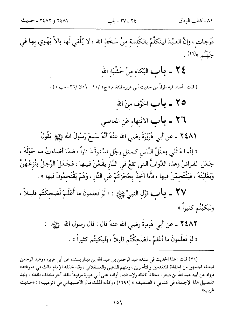 27 - باب قوْلِ النبيِّ - صلى الله عليه وسلم -: "لَوْ تَعلمونَ ما أَعْلَمُ لَضحِكْتُم قليلاً، ولبَكَيْتُم كثيراً"