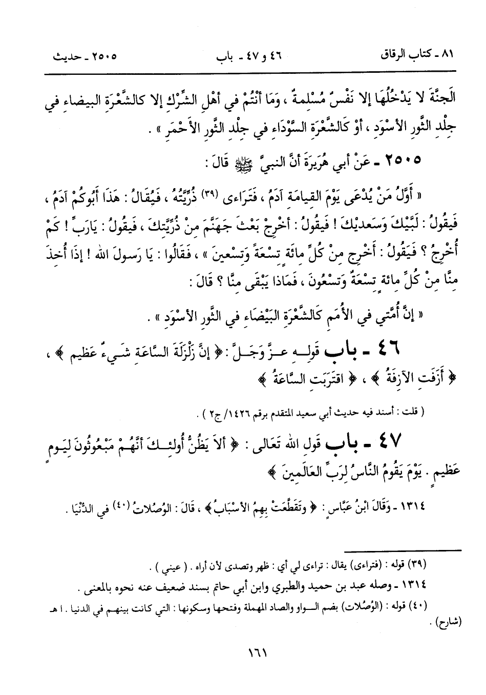"أَوَّلُ مَنْ يُدْعَى يَوْمَ القِيامَةِ آدَمُ، فَتَرَاءى (39) ذُرِّيَّتُهُ، فَيُقَالُ: هَذَا أَبُوكُمْ آدَمُ، فَيقُولُ: لَبَّيْكَ وَسَعديْكَ! فَيقُولُ: أخْرِجْ بَعْثَ جَهَنَّمَ مِنْ ذُرِّيَّتِكَ، فَيقُولُ: يَارَبِّ! كَمْ أُخْرِجُ؟ فَيَقُولُ: أَخْرِج مِنْ كُلِّ مِائَةٍ تِسْعَةً وَتِسْعينَ"، فَقَالُوا: يَا رَسولَ الله! إذَا أُخِذَ مِنَّا مِنْ كُلِّ مِائةٍ تِسْعَةٌ وَتسْعُونَ، فَمَاذا يَبْقَى مِنَّا؟ قَالَ: