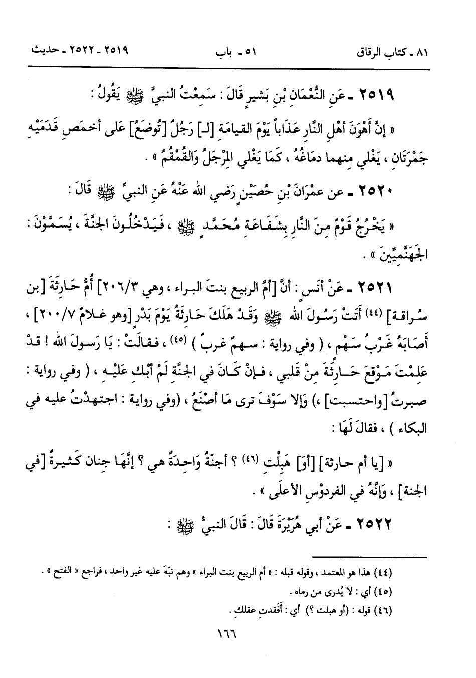 2521 - عَنْ أنَسٍ: أنَّ [أمَّ الربيع بنتَ البراء، وهي 3/ 206] أُمُّ حَارِثَةَ [بن سُراقة] (44) أَتَتْ رَسُولَ الله - صلى الله عليه وسلم - وَقَدْ هَلَكَ حَارِثَةُ يَوْمَ بَدْرٍ [وهو غلامٌ 7/ 200]، أَصَابَهُ غَرْبُ سَهْمٍ، (وفي روايةٍ: سهمٌ غربٌ) (45)، فقالَتْ: يَا رَسولَ الله! قدْ عَلِمْتَ مَوْقعَ حَارِثةَ مِنْ قَلبي، فإنْ كَانَ في الجنَّةِ لَمْ أبْكِ عَليْهِ، (وفي روايةٍ: صبرتُ [واحتسبت]،) وَإلا سَوْفَ ترى مَا أصْنَعُ، (وفي روايةٍ: اجتهدْتُ عليه في البكاء)، فقالَ لَهَا:
