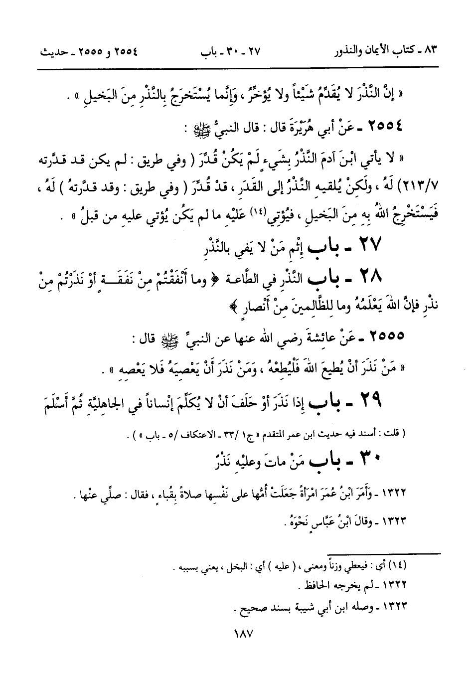 "لا يأتي ابْنَ آدمَ النَّذْرُ بِشَيءٍ لَمْ يَكُنْ قُدِّرَ (وفي طريق: لم يكن قد قدَّرته 7/ 213) لَهُ، ولَكِنْ يُلقيهِ النَّذْرُ إلى القَدَرِ، قدْ قُدِّرَ (وفي طريق: وقد قدَّرتهُ) لَهُ، فَيَسْتَخْرِجُ اللهُ بِهِ مِنَ البَخيلِ، فيُؤتِي (14) عَليْهِ ما لم يَكُن يُؤتي عليهِ من قبلُ".