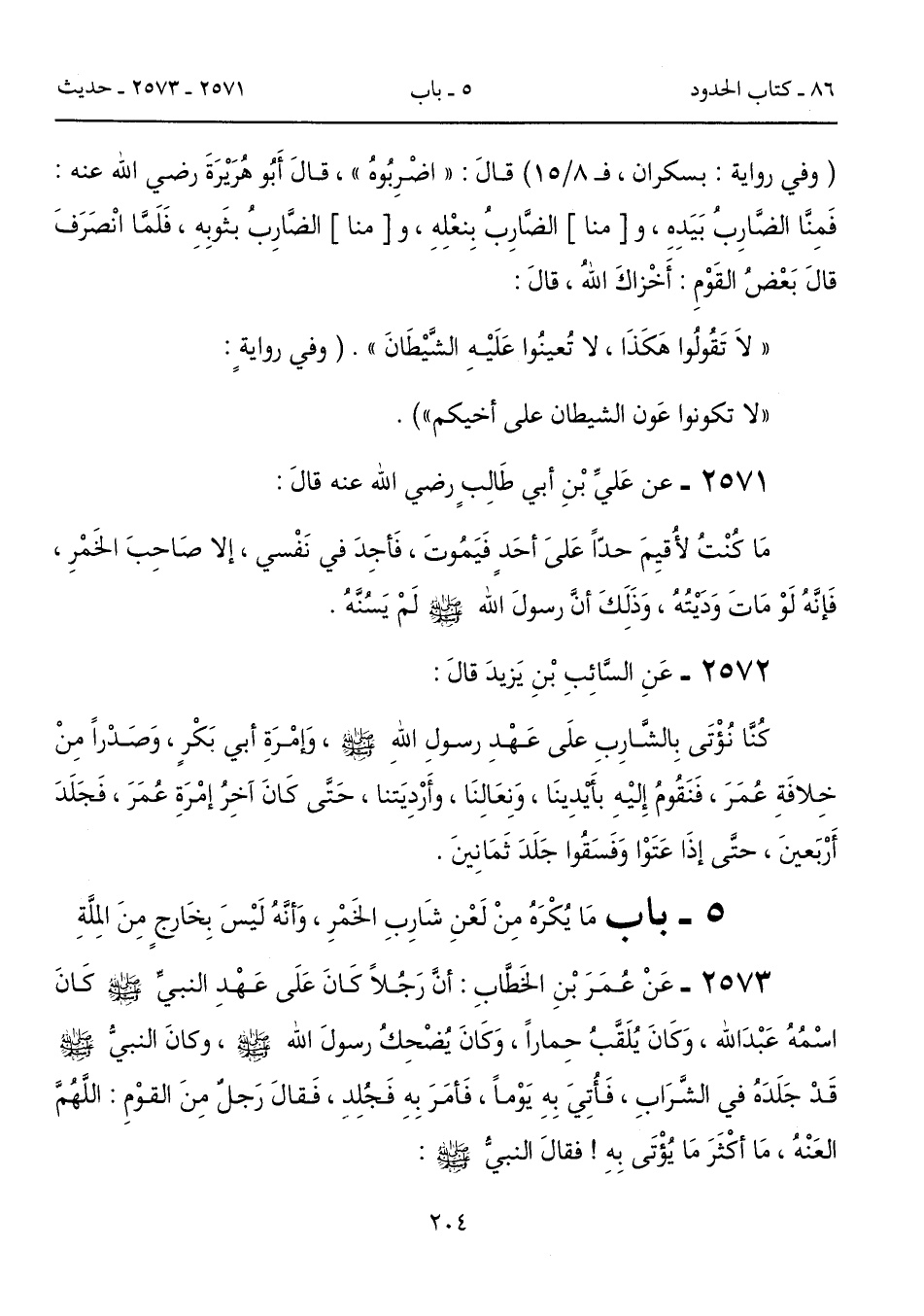 2573 - عَنْ عُمَرَ بْنِ الخَطَّابِ: أنَّ رَجُلاً كَانَ عَلَى عَهْدِ النبيِّ - صلى الله عليه وسلم - كَانَ اسْمُه عَبْدَ الله، وَكَانَ يُلَقَّبُ حِماراً، وَكَانَ يُضْحِكُ رسولَ الله - صلى الله عليه وسلم -، وكانَ النبيُّ - صلى الله عليه وسلم - قَدْ جَلَدَهُ في الشَّرَابِ، فَأُتِيَ بِهِ يَوْماً، فَأمَرَ بِهِ فَجُلِدِ، فَقالَ رَجلٌ مِنَ القوْمِ: اللَّهُمَّ العَنْهُ، مَا أكْثَرَ مَا يُؤْتَى بِهِ! فقالَ النبيُّ - صلى الله عليه وسلم -: