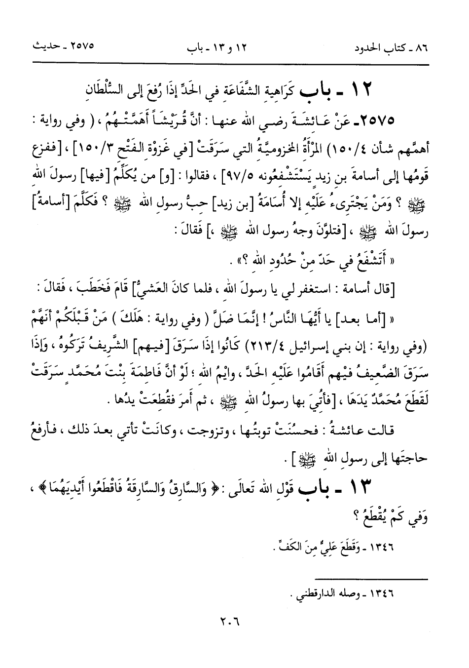 2575 - عَنْ عَائِشَةَ رضي الله عنها: أنَّ قُرَيْشًا أَهَمَّتْهُمُ، (وفي روايةٍ: أهمَّهم شأن 4/ 150) المرْأَةُ المخزوميَّةُ التي سَرَقَتْ [في غَزوْةِ الفَتْحِ 3/ 150]، [ففزع قَومُها إلى أسامةَ بنِ زيدٍ يَسْتَشْفِعُونه 5/ 97]، فقالوا: [و] من يُكَلِّمُ [فيها] رسولَ اللهِ - صلى الله عليه وسلم -؟ وَمَنْ يَجْتَرئُ عَلَيْهِ إلا أُسَامَةُ [بن زيد] حِبُّ رسولِ الله - صلى الله عليه وسلم -؟ فَكَلَّمَ [أسامةُ] رسولَ الله - صلى الله عليه وسلم -، [فتلوَّنَ وجهُ رسول الله - صلى الله عليه وسلم -،] فَقالَ: