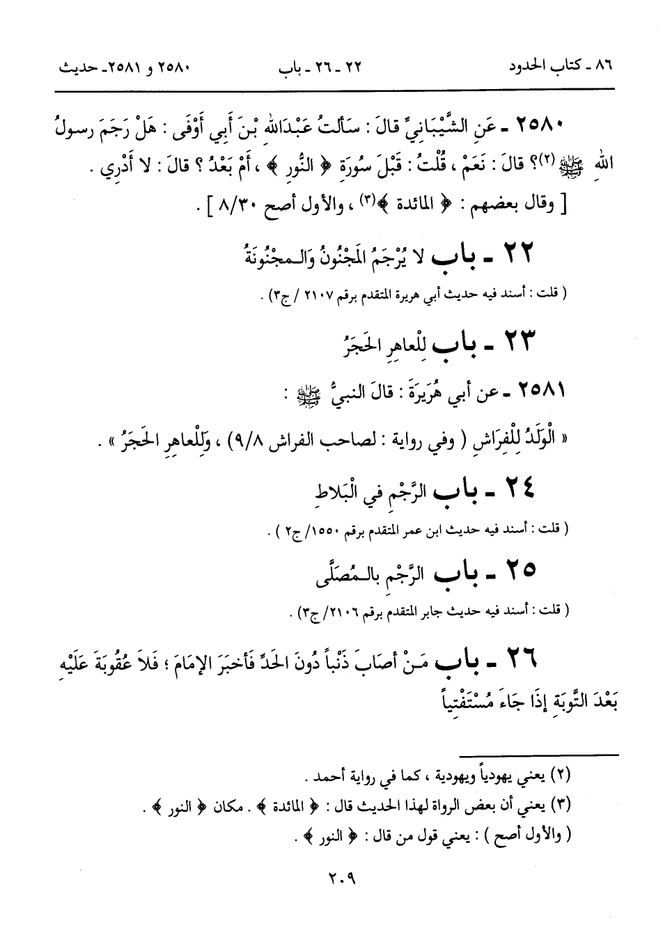 2580 - عَنِ الشَّيْبَانِيِّ قالَ: سَألتُ عَبْدَ اللهِ بْنَ أَبِي أَوْفَى: هَلْ رَجَمَ رسولُ اللهِ - صلى الله عليه وسلم - (2)؟ قالَ: نَعَمْ، قُلْتُ: قَبْلَ سُورَةِ (النُّورِ)، أَمْ بَعْدُ؟ قالَ: لا أَدْرِي.