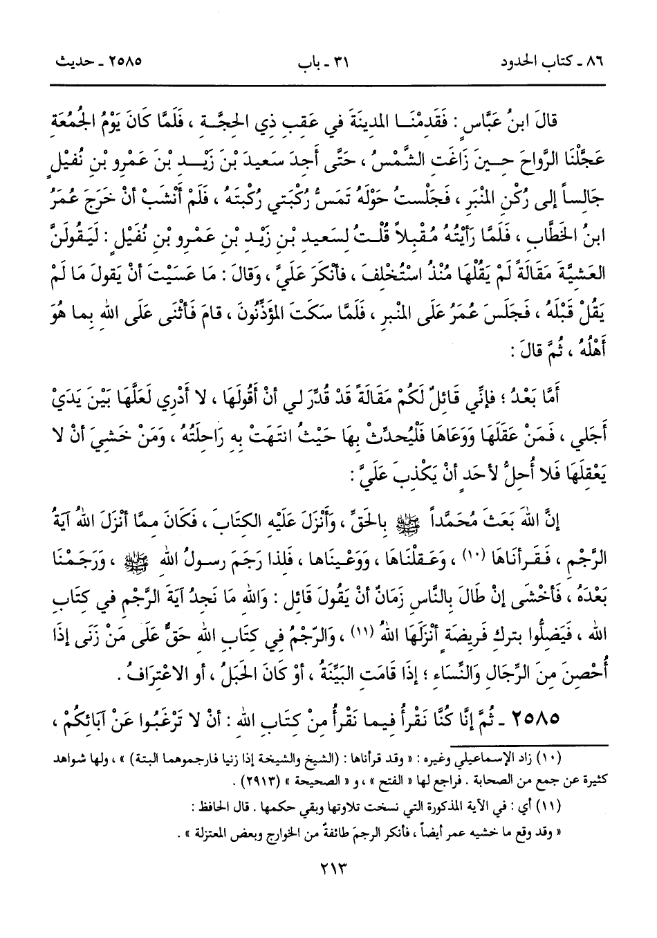 إِنَّ اللَّهَ بَعَثَ مُحَمَّدًا - صلى الله عليه وسلم - بِالْحَقِّ، وَأَنْزَلَ عَلَيْهِ الْكِتَابَ، فَكَانَ مِمَّا أَنْزَلَ اللَّهُ آيَةُ الرَّجْمِ، فَقَرَأْنَاهَا (10)، وَعَقَلْنَاهَا، وَوَعَيْنَاهَا، فَلِذا رَجَمَ رَسُولُ اللَّهِ - صلى الله عليه وسلم -، وَرَجَمْنَا بَعْدَهُ، فَأَخْشَى إِنْ طَالَ بِالنَّاسِ زَمَانٌ أَنْ يَقُولَ قَائِلٌ: وَاللَّهِ مَا نَجِدُ آيَةَ الرَّجْمِ فِى كِتَابِ اللَّهِ، فَيَضِلُّوا بِتَرْكِ فَرِيضَةٍ أَنْزَلَهَا اللَّهُ (11)، وَالرَّجْمُ فِى كِتَابِ اللَّهِ حَقٌّ عَلَى مَنْ زَنَى إِذَا أُحْصِنَ مِنَ الرِّجَالِ وَالنِّسَاءِ؛ إِذَا قَامَتِ الْبَيِّنَةُ، أَوْ كَانَ الْحَبَلُ، أَوْ الاِعْتِرَافُ.