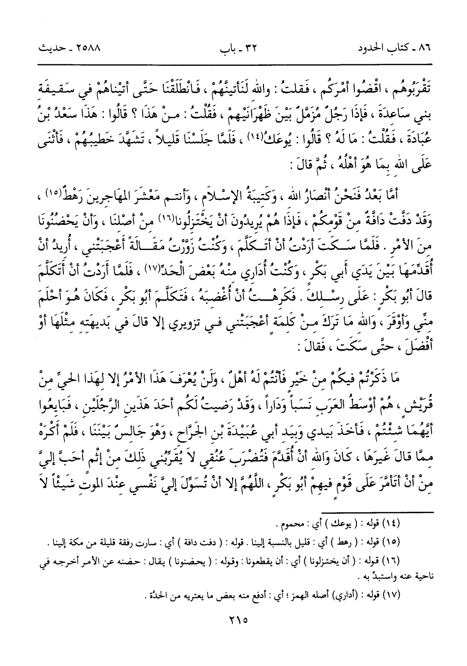 أَمَّا بَعْدُ فَنَحْنُ أَنْصَارُ اللَّهِ، وَكَتِيبَةُ الإِسْلاَمِ، وَأَنْتُمْ مَعْشَرَ الْمُهَاجِرِينَ رَهْطٌ (15)، وَقَدْ دَفَّتْ دَافَّةٌ مِنْ قَوْمِكُمْ، فَإِذَا هُمْ يُرِيدُونَ أَنْ يَخْتَزِلُونَا (16) مِنْ أَصْلِنَا، وَأَنْ يَحْضُنُونَا مِنَ الأَمْرِ. فَلَمَّا سَكَتَ أَرَدْتُ أَنْ أَتَكَلَّمَ، وَكُنْتُ زَوَّرْتُ مَقَالَةً أَعْجَبَتْنِى، أُرِيدُ أَنْ أُقَدِّمَهَا بَيْنَ يَدَىْ أَبِى بَكْرٍ، وَكُنْتُ أُدَارِى مِنْهُ بَعْضَ الْحَدِّ (17)، فَلَمَّا أَرَدْتُ أَنْ أَتَكَلَّمَ قَالَ أَبُو بَكْرٍ: عَلَى رِسْلِكَ. فَكَرِهْتُ أَنْ أُغْضِبَهُ، فَتَكَلَّمَ أَبُو بَكْرٍ، فَكَانَ هُوَ أَحْلَمَ مِنِّى وَأَوْقَرَ، وَاللَّهِ مَا تَرَكَ مِنْ كَلِمَةٍ أَعْجَبَتْنِى فِى تَزْوِيرِى إِلاَّ قَالَ فِى بَدِيهَتِهِ مِثْلَهَا أَوْ أَفْضَلَ مِنْهَا حَتَّى سَكَتَ، فَقَالَ: