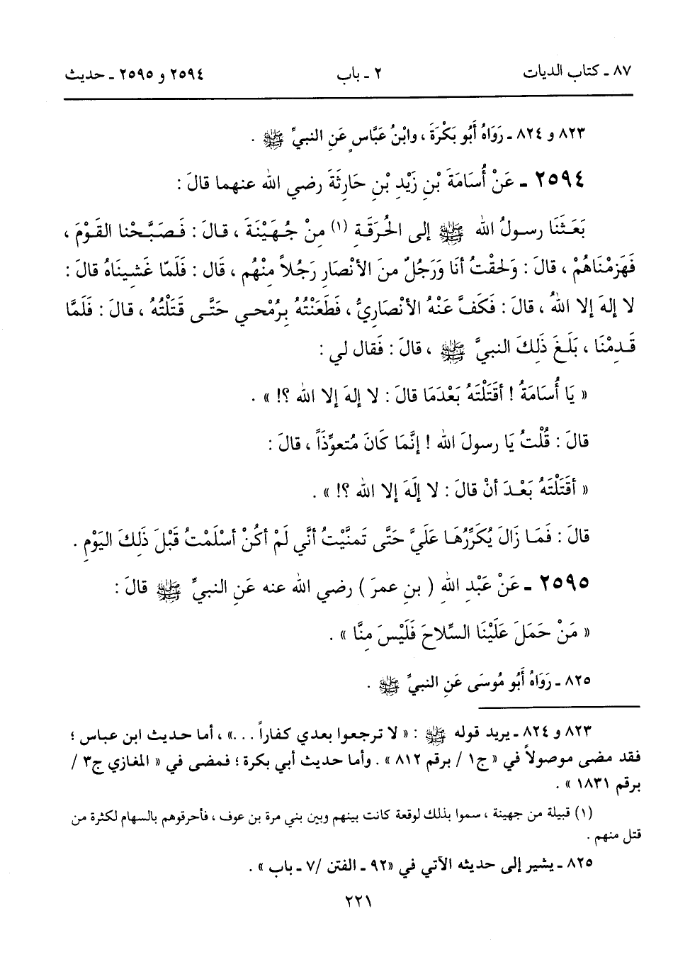بَعَثَنَا رَسُولُ اللَّهِ - صلى الله عليه وسلم - إِلَى الْحُرَقَةِ (1) مِنْ جُهَيْنَةَ، قَالَ: فَصَبَّحْنَا الْقَوْمَ، فَهَزَمْنَاهُمْ، قَالَ: وَلَحِقْتُ أَنَا وَرَجُلٌ مِنَ الأَنْصَارِ رَجُلاً مِنْهُمْ، قَالَ: فَلَمَّا غَشِينَاهُ قَالَ: لَا إِلَهَ إِلاَّ اللَّهُ، قَالَ: فَكَفَّ عَنْهُ الأَنْصَارِىُّ، فَطَعَنْتُهُ بِرُمْحِى حَتَّى قَتَلْتُهُ، قَالَ: فَلَمَّا قَدِمْنَا، بَلَغَ ذَلِكَ النَّبِيَّ - صلى الله عليه وسلم -، قَالَ: فَقَالَ لِي: