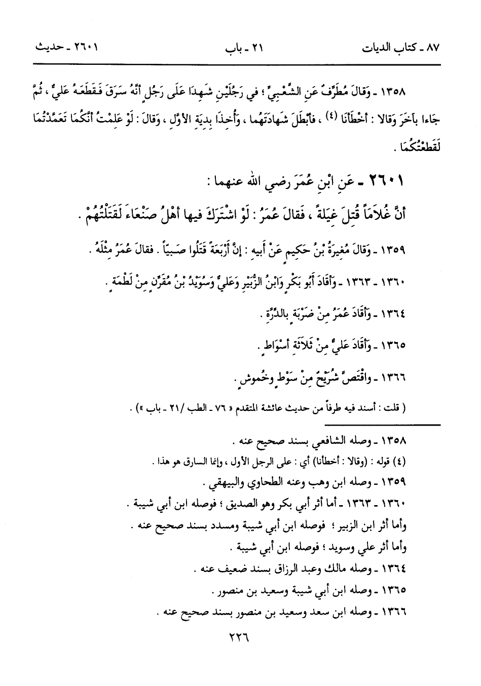 1358 - وَقالَ مُطَرِّفٌ عَنِ الشَّعْبِىِّ؟ في رَجُلَيْنِ شَهِدَا عَلَى رَجُلٍ أنَّهُ سَرَقَ فَقَطَعَهُ عَلىٌّ، ثُمَّ جَاءا بآخَرَ وَقالا: أخْطَأنَا (4)، فأبْطَلَ شَهادَتَهُما، وَأُخِذَا بِدِيَةِ الأوَّلِ، وَقالَ: لَوْ عَلِمْتُ أنَّكُمَا تَعَمَّدْتُمَا لَقَطعْتُكُمَا.