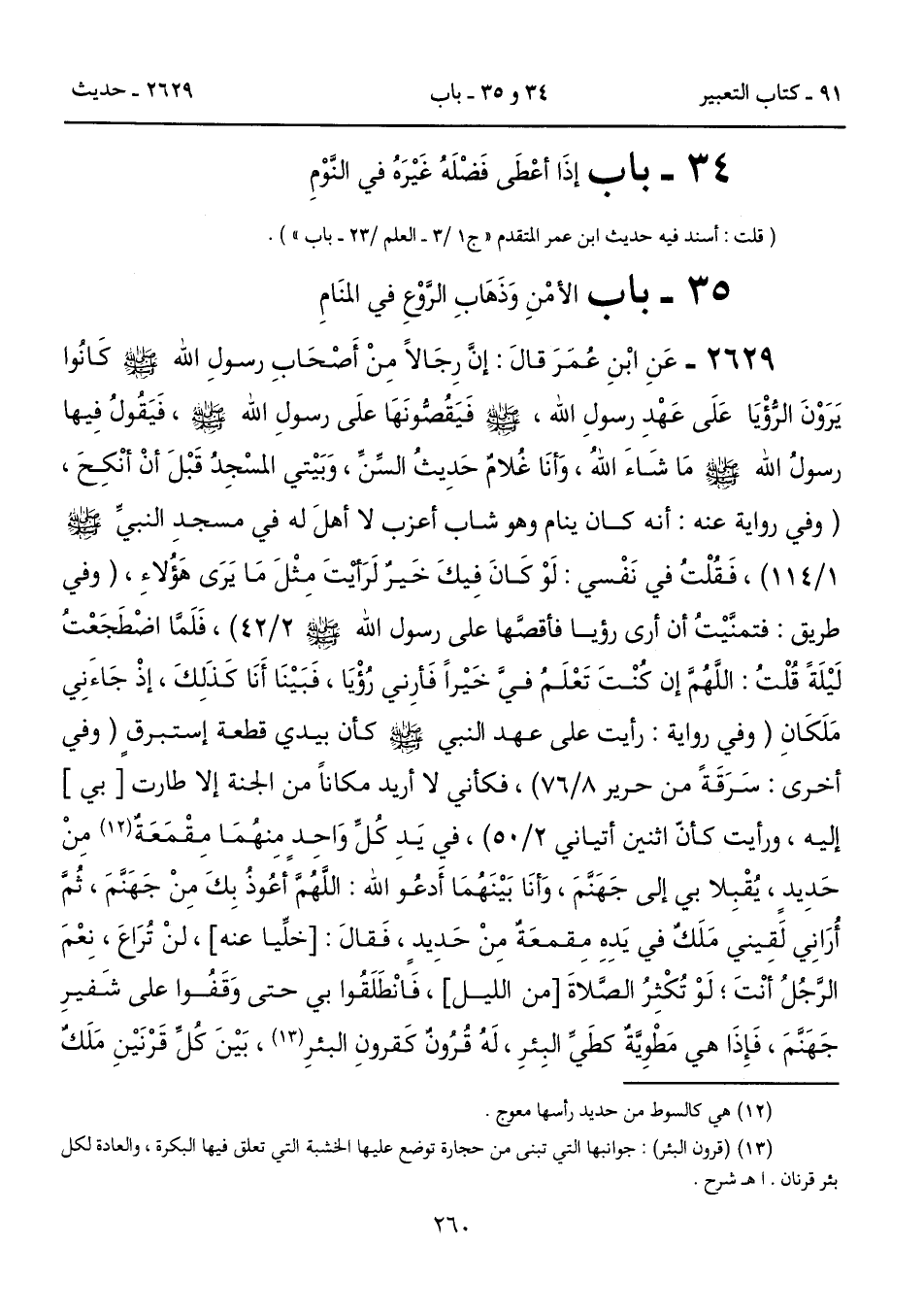2629 - عَنِ ابْنِ عُمَرَ قالَ: إنَّ رِجَالاً مِنْ أَصْحَابِ رسولِ الله - صلى الله عليه وسلم - كَانُوا يَرَوْنَ الرُّؤْيَا عَلَى عَهْدِ رَسُولِ اللَّهِ - صلى الله عليه وسلم -، فَيَقُصُّونَهَا عَلَى رَسُولِ اللَّهِ - صلى الله عليه وسلم -، فَيَقُولُ فِيهَا رَسُولُ اللَّهِ - صلى الله عليه وسلم - مَا شَاءَ اللَّهُ، وَأَنَا غُلاَمٌ حَدِيثُ السِّنِّ، وَبَيْتِى الْمَسْجِدُ قَبْلَ أَنْ أَنْكِحَ، (وفي رواية عنه: أنه كان ينام وهو شاب أعزب لا أهلَ له في مسجد النبيِّ - صلى الله عليه وسلم - 1/ 114)، فَقُلْتُ فِى نَفْسِى: لَوْ كَانَ فِيكَ خَيْرٌ لَرَأَيْتَ مِثْلَ مَا يَرَى هَؤُلاَءِ، (وفي طريق: فتمنَّيتُ أن أري رؤيا فأقصَّها على رسول الله - صلى الله عليه وسلم - 2/ 42)، فَلَمَّا اضْطَجَعْتُ لَيْلَةً قُلْتُ: اللَّهُمَّ إِنْ كُنْتَ تَعْلَمُ فِىَّ خَيْرًا فَأَرِنِى رُؤْيَا، فَبَيْنَا أَنَا كَذَلِكَ، إِذْ جَاءَنِى مَلَكَانِ (وفي روايةٍ: رأيت علي عهد النبيّ - صلى الله عليه وسلم - كأن بيدي قطعة إستبرقٍ (وفي أخري: سَرَقَةً من حرير 8/ 76)، فكأني لا أريد مكاناً من الجنة إلا طارت [بي] إليه، ورأيت كأنّ اثنين أتياني 2/ 50)، فِى يَدِ كُلِّ وَاحِدٍ مِنْهُمَا مَقْمَعَةٌ (12) مِنْ حَدِيدٍ، يُقْبِلاَ بِى إِلَى جَهَنَّمَ، وَأَنَا بَيْنَهُمَا أَدْعُو اللَّهَ: اللَّهُمَّ أَعُوذُ بِكَ مِنْ جَهَنَّمَ، ثُمَّ أُرَانِى لَقِيَنِى مَلَكٌ فِى يَدِهِ مِقْمَعَةٌ مِنْ حَدِيدٍ فَقَالَ: [خلِّيا عنه]، لَنْ تُرَاعَ، نِعْمَ الرَّجُلُ أَنْتَ؛ لَوْ تُكْثِرُ الصَّلاَةَ [من الليل]، فَانْطَلَقُوا بِى حَتَّى وَقَفُوا عَلَى شَفِيرِ جَهَنَّمَ، فَإِذَا هِيَ مَطْوِيَّةٌ كَطَىِّ الْبِئْرِ، لَهُ قُرُونٌ كَقَرْنِ الْبِئْرِ (13)، بَيْنَ كُلِّ قَرْنَيْنِ مَلَكٌ