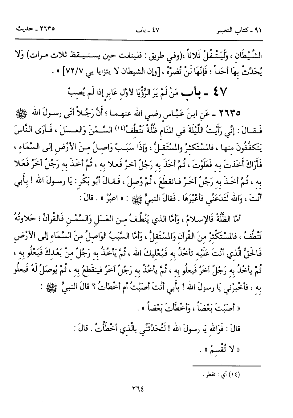 2635 - عَنِ ابنَ عَبَّاس رضي الله عنهما؛ أَنَّ رَجُلاً أتَى رسولَ الله - صلى الله عليه وسلم - فَقالَ: إنِّي رَأَيْتُ اللَّيْلَةَ في المنَامِ ظُلَّةً تَنْطِفُ (14) السَّمْنَ وَالعسَلَ، فَأرَى النَّاسَ يَتَكفَّفُونَ مِنها، فالمسْتَكثِرُ والمسْتَقِلُّ، وَإذَا سَبَبٌ وَاصِلٌ مِنَ الأرْضِ إلى السَّمَاءِ، فَأَرَاكَ أَخَذتَ بِهِ فَعَلَوْتَ، ثُمَّ أخَذَ بِهِ رَجُلٌ آخرُ فَعلا بِهِ، ثُمَّ أخَذَ بِهِ رَجُلٌ آخَرُ فَعَلا بِهِ، ثُمَّ أخَذَ بِهِ رَجُلٌ آخَرُ فانقطَعَ، ثُمَّ وُصِلَ، فَقالَ أبُو بَكْرٍ: يَا رسولَ الله! بِأَبي أنْتَ، وَالله لَتَدَعَنِّي فأعْبُرَهَا. فَقالَ النبيُّ - صلى الله عليه وسلم -: "اعبُرْ". قالَ: