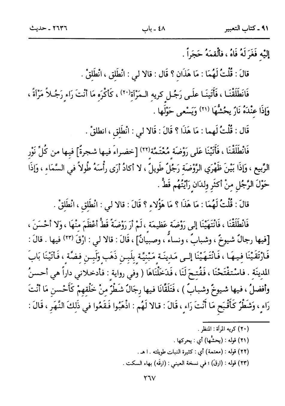 فَانْطَلَقْنَا، فَانْتَهَيْنَا إلى رَوْضَةٍ عَظيمَةٍ، لَمْ أرَ رَوْضَةً قَطُّ أعْظَمَ منْهَا، وَلا أحْسَنَ، [فيها رجالٌ شيوخٌ، وشبابٌ، ونساءٌ، وصبيانٌ]، قَالَ: قالا لي: ارْقَ (23) فيها. قالَ: فَارْتَقَيْنَا فِيهَا، فَانْتَهَيْنَا إلى مَدِينَةٍ مَبْنِيَّة بِلَبِنِ ذَهَبٍ وَلَبِنِ فِضَّةٍ، فَأتَيْنَا بَابَ المدِينَةِ. فاسْتفْتَحْنَا، فَفُتِحَ لَنَا، فَدَخَلْنَاهَا (وفي روايةٍ: فأدخلاني داراً هي أحسنُ وأفضلُ، فيها شيوخٌ وشبابٌ)، فَتَلَقَّانَا فيها رِجَالٌ شَطْرٌ مِنْ خَلْقِهِمْ كَأَحْسنِ مَا أنْتَ رَاءٍ، وَشَطرٌ كَأَقْبَحِ مَا أَنتَ رَاءٍ، قَالَ: قالا لَهُم: اذْهَبُوا فَقَعُوا في ذَلِكَ النَّهَرِ، قَالَ: