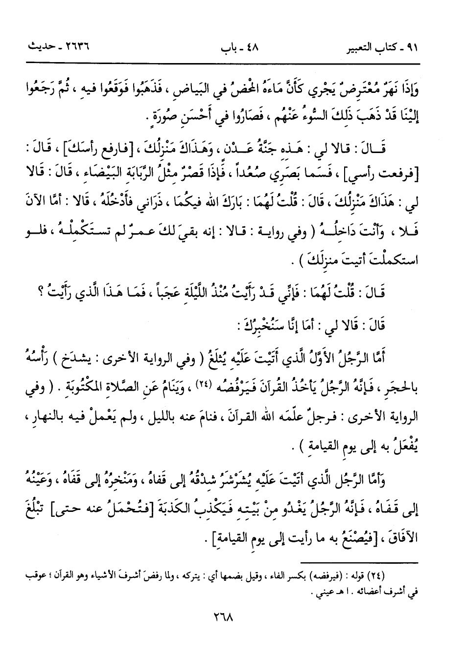 أمَّا الرَّجُلُ الأَوَّلُ الَّذي أَتَيْتَ عَلَيْهِ يُثلَغُ (وفي الرواية الأخرى: يشدَخ) رَأسُهُ بالحجَرِ، فَإنَّهُ الرَّجُلُ يَأخُذُ القُرآنَ فَيَرْفُضُه (24)، وَيَنَامُ عَنِ الصَّلاةِ المكْتُوبَةِ. (وفي الرواية الأخرى: فرجلٌ علّمَه الله القرآنَ، فنامَ عنه بالليل، ولم يَعْملْ فيه بالنهارِ، يُفْعَلُ به إلى يومِ القيامةِ).