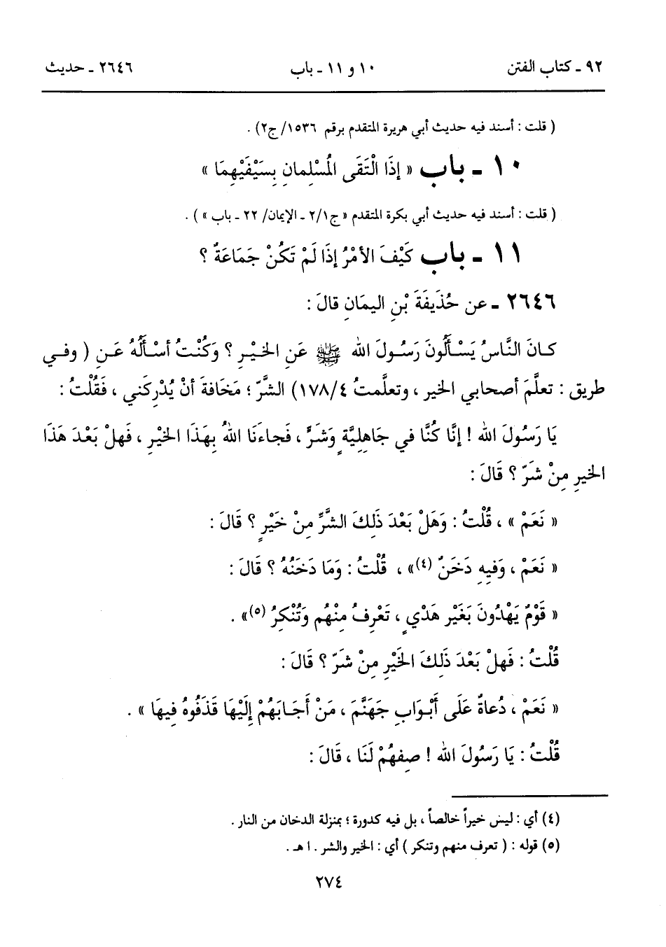 كانَ النَّاسُ يَسْأَلُونَ رَسُولَ الله - صلى الله عليه وسلم - عَنِ الخيْرِ؟ وَكُنْتُ أسْأَلُهُ عَنِ (وفي طريق: تعلَّمَ أصحابي الخير، وتعلَّمتُ 4/ 178) الشَّرّ؛ مَخَافةَ أنْ يُدْرِكَني، فَقُلْتُ: