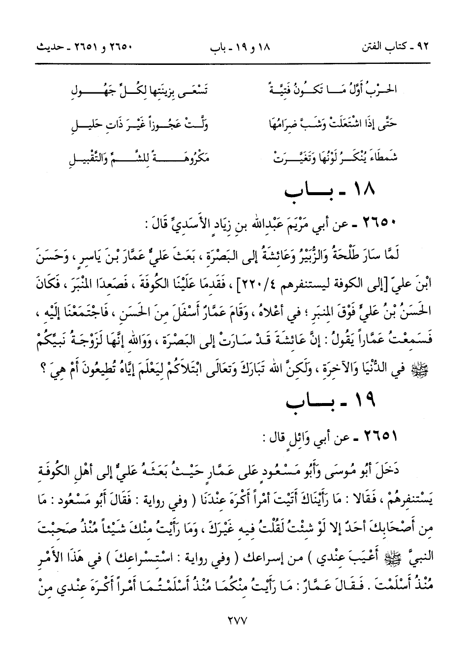 دَخَلَ أبُو مُوسَى وَأَبُو مَسْعُودٍ عَلى عَمَّارٍ حَيْثُ بَعَثَهُ عَليٌّ إلى أهْلِ الكُوفَةِ يَسْتنفِرهُمْ، فَقَالا: مَا رَأَيْنَاكَ أَتَيْتَ أمْراً أَكْرَهَ عِنْدَنَا (وفي روايةٍ: فَقَالَ أَبُو مَسْعُود: مَا مِن أَصْحَابِكَ أحَدٌ إلا لَوْ شِئْتُ لَقُلْتُ فِيهِ غَيْرَكَ، وَمَا رَأَيْتُ مِنْكَ شَيْئاً مُنْذُ صَحِبْتَ النبيَّ - صلى الله عليه وسلم - أَعْيَبَ عِنْدي) من إسراعك (وفي روايةٍ: اسْتِسْراعِكَ) في هَذَا الأَمرِ مُنْذُ أَسْلَمْتَ. فَقَالَ عَمَّارٌ: مَا رَأَيْتُ مِنْكُمَا مُنْذُ أَسْلَمْتُمَا أَمْراً أَكْرَهَ عِنْدي مِنْ