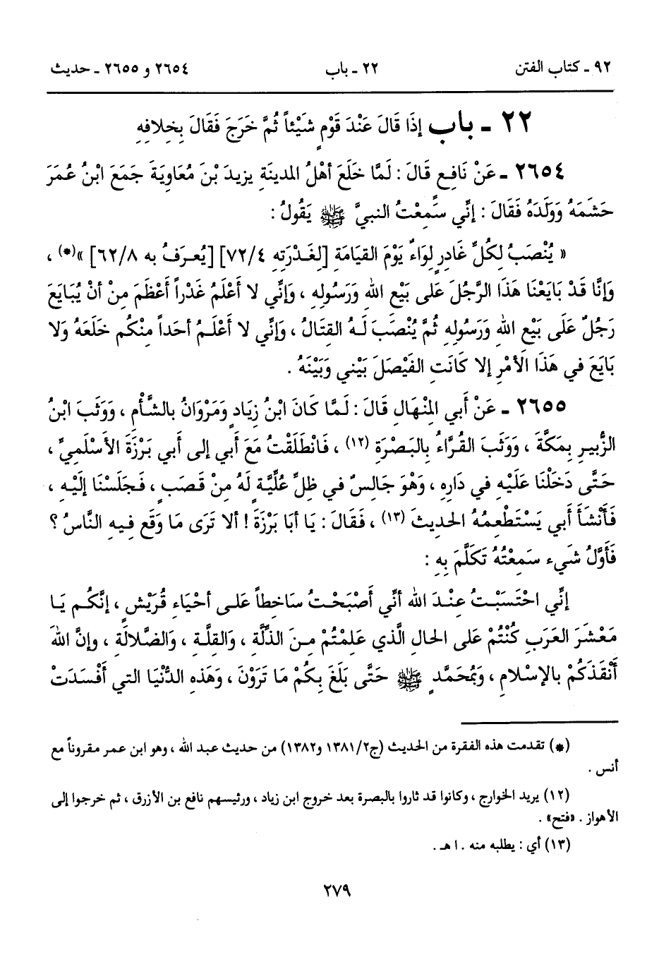 2655 - عَنْ أَبي المِنْهَالِ قَالَ: لَمَّا كَانَ ابْنُ زِيَادٍ وَمَرْوَانُ بالشَّأْمِ، وَوَثَبَ ابْنُ الزُّبيرِ بِمَكَّةَ، وَوَثَبَ القُرَّاءُ بِالبَصْرَةِ (12)، فَانْطَلَقْتُ مَعَ أَبي إلى أَبي بَرْزَةَ الأَسْلَمِيِّ، حَتَّى دَخَلْنَا عَلَيْهِ في دَارِهِ، وَهْوَ جَالِسٌ في ظِلِّ عُلِّيَّةٍ لَهُ مِنْ قَصَبٍ، فَجَلَسْنَا إلَيْهِ، فَأَنْشَأَ أَبي يَسْتَطْعِمُهُ الحدِيثَ (13)، فَقَالَ: يَا أبَا بَرْزَةَ! ألا تَرَى مَا وَقَع فِيهِ النَّاسُ؟ فَأوَّلُ شَيء سَمِعْتُهُ تَكَلَّمَ بِهِ: