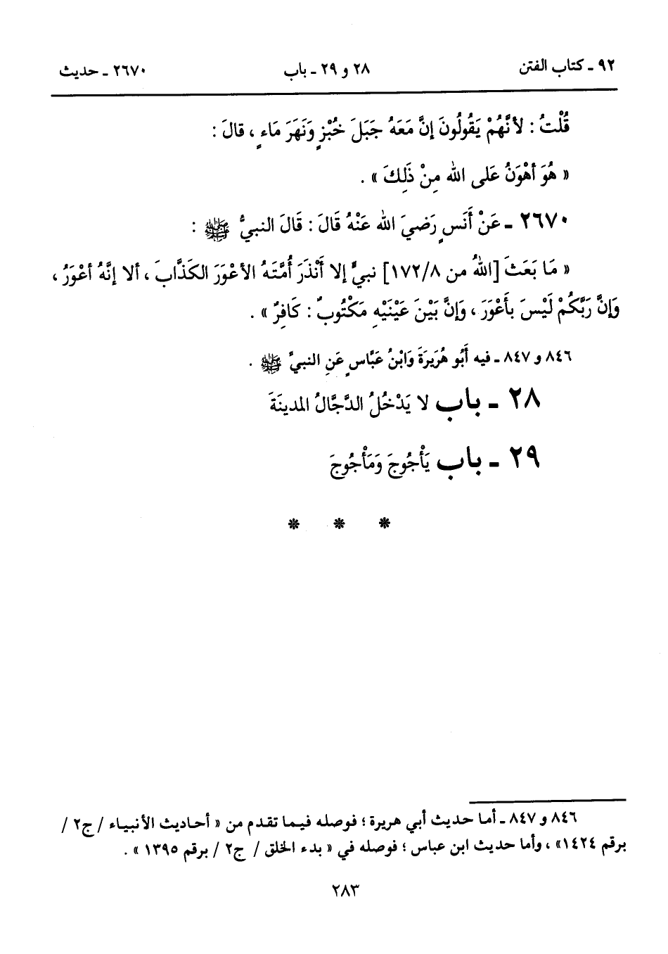 "مَا بَعَثَ [اللهُ من 8/ 172] نبيٍّ إلا أَنْذَرَ أُمَّتَهُ الأعْوَرَ الكَذَّابَ، ألا إنَّهُ أعْوَرُ، وَإنَّ رَبَّكُمْ لَيْسَ بأَعْوَرَ، وَإنَّ بَيْنَ عَيْنَيْهِ مَكْتُوبٌ: كَافِرٌ".