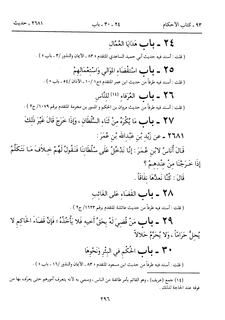 (14) جمع (عريف)، وهو القائم بأمر طائفة من الناس، وسمي به لأنه يتعرف أمورهم حتى يعرّف بها من فوقه عند الحاجة لذلك.