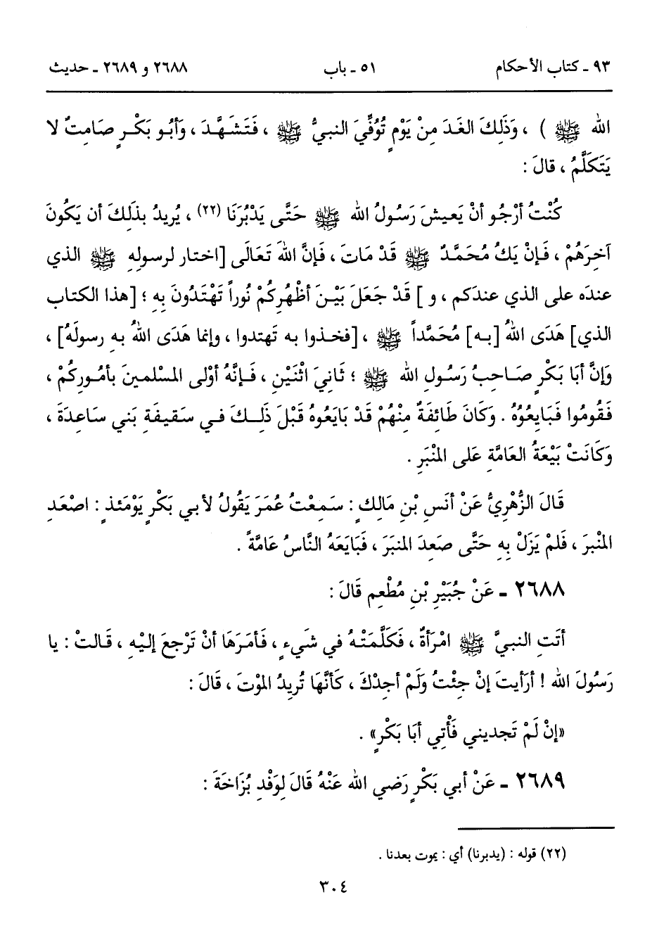 كُنْتُ أرْجُو أنْ يَعيشَ رَسُولُ الله - صلى الله عليه وسلم - حَتَّى يَدْبُرَنَا (22)، يُريدُ بذَلِكَ أن يَكُونَ آخِرَهُمْ، فَإنْ يَكُ مُحَمَّدٌ - صلى الله عليه وسلم - قَدْ مَاتَ، فَإنَّ اللهَ تَعَالَى [اختار لرسولِهِ - صلى الله عليه وسلم - الذي عندَه على الذي عندَكم، و] قَدْ جَعَلَ بَيْنَ أظْهُرِكُمْ نُوراً تَهْتَدُونَ بِهِ؛ [هذا الكتاب الذي] هَدَى اللهُ [به] مُحَمَّداً - صلى الله عليه وسلم -، [فخذوا به تَهتدوا، وإنما هَدَى اللهُ بهِ رسولَهُ]، وَإنَّ أبَا بَكْرٍ صَاحِبُ رَسُولِ الله - صلى الله عليه وسلم -؛ ثَانِيَ اثْنَيْنِ، فَإنَّهُ أوْلى المسْلمينَ بأمُورِكُمْ، فَقُومُوا فَبَايِعُوُهُ. وَكَانَ طَائِفَةٌ مِنْهُمْ قَدْ بَايَعُوهُ قَبْلَ ذَلِكَ في سَقيفَةِ بَني سَاعِدَةَ، وَكَانَتْ بَيْعَةُ العَامَّةِ عَلى المنْبَرِ.