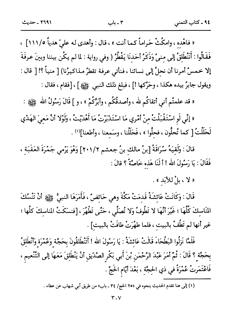 قَالَ: وَكَانَتْ عَائِشَةُ قَدِمَتْ مَكَّةَ وهي حَائِضٌ، فَأَمَرَهَا النبيُّ - صلى الله عليه وسلم - أنْ تَنْسُكَ المنَاسِكَ كُلَّهَا؛ غَيْرَ أنَّهَا لا تَطُوفُ وَلا تُصَلِّي، حَتَّى تَطْهُرَ، [فنسَكَتْ المناسِكَ كلَّها؛ غير أنها لم تَطُفْ بالبيتِ، فلما طهُرَتْ طافَتْ بالبيتِ].