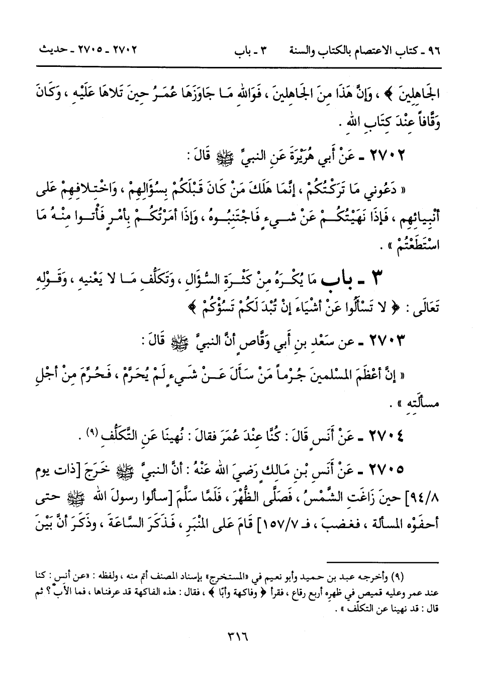 3 - باب مَا يُكْرَهُ مِنْ كَثْرَةِ السُّؤَالِ، وَتَكَلُّفِ مَا لا يَعْنيهِ، وَقَوْلِهِ تَعَالَى: (لَا تَسْأَلُوا عَنْ أَشْيَاءَ إِنْ تُبْدَ لَكُمْ تَسُؤْكُمْ)