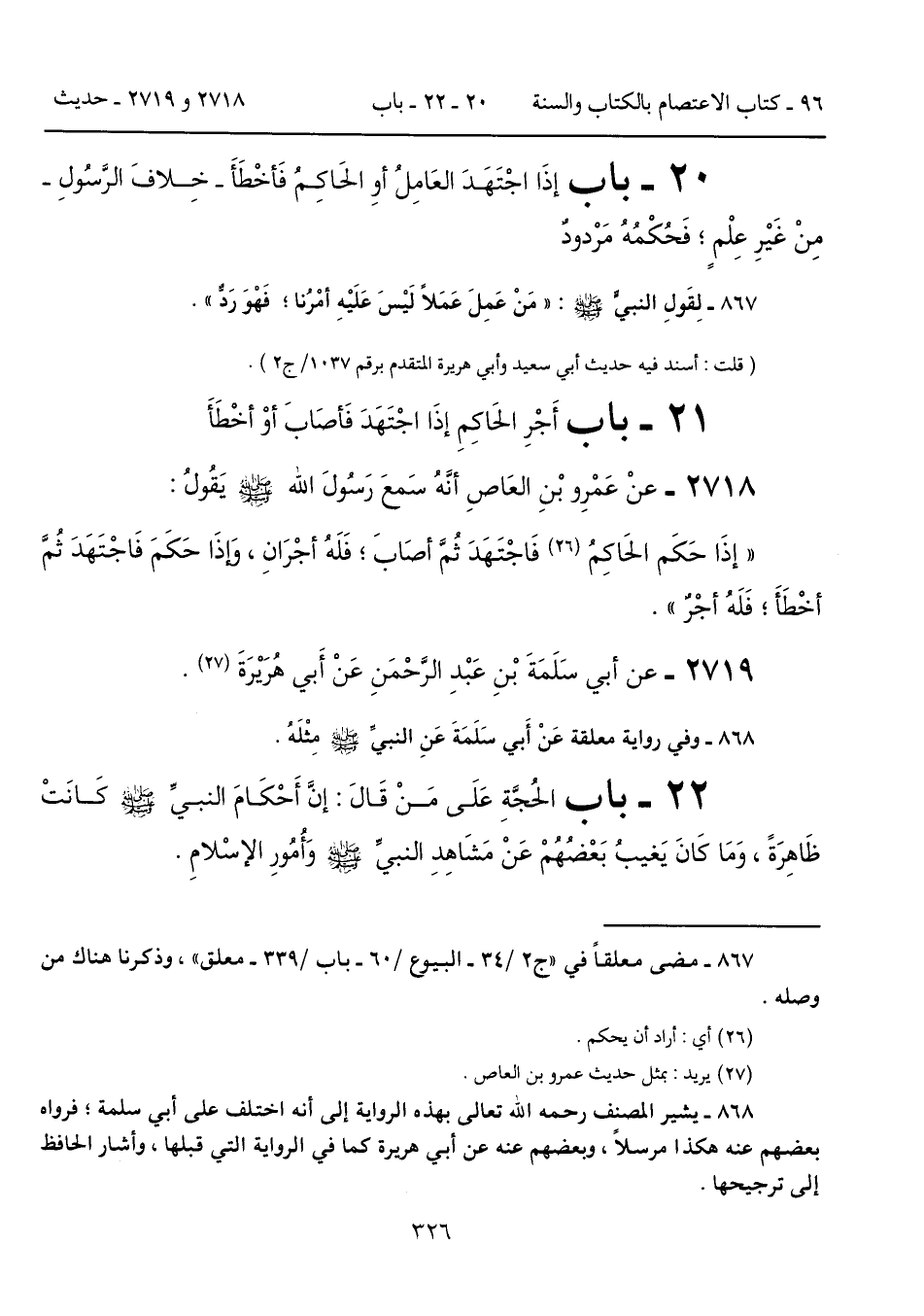 "إذَا حَكَم الحَاكِمُ (26) فَاجْتَهَدَ ثُمَّ أصَابَ؛ فَلَهُ أجْرَانِ، وَإذَا حَكَمَ فَاجْتَهَدَ ثمَّ أخْطَأَ، فَلَهُ أجْرٌ".