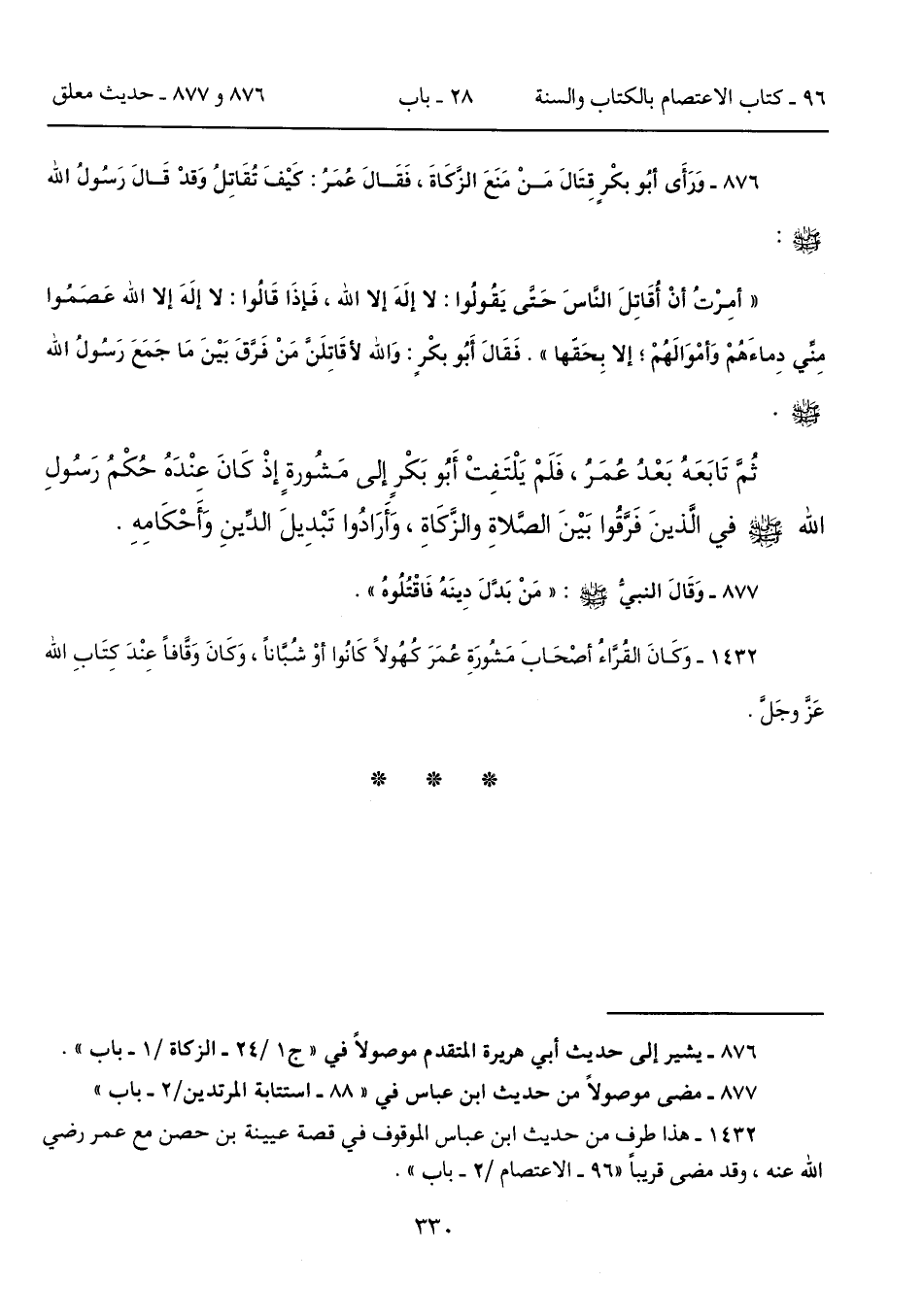 876 - وَرَأَى أبُو بكْرٍ قِتَالَ مَنْ مَنَعَ الزَّكَاةَ، فَقَالَ عُمَرُ: كَيْفَ تُقَاتِلُ وَقدْ قَالَ رَسُولُ الله - صلى الله عليه وسلم -: