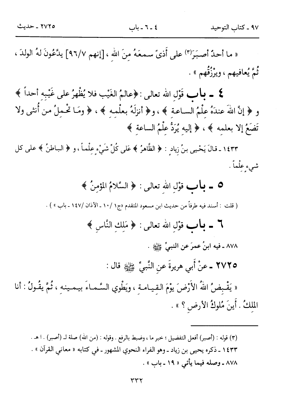 4 - باب قَوْلِ الله تعالى: {عَالِمُ الْغَيْبِ فَلَا يُظْهِرُ عَلَى غَيْبِهِ أَحَدًا} و {إِنَّ اللَّهَ عِنْدَهُ عِلْمُ السَّاعَةِ}، و {أَنْزَلَهُ بِعِلْمِهِ}، {وَمَا تَحْمِلُ مِنْ أُنْثَى وَلَا تَضَعُ إِلَّا بِعِلْمِهِ}، {إِلَيْهِ يُرَدُّ عِلْمُ السَّاعَةِ}