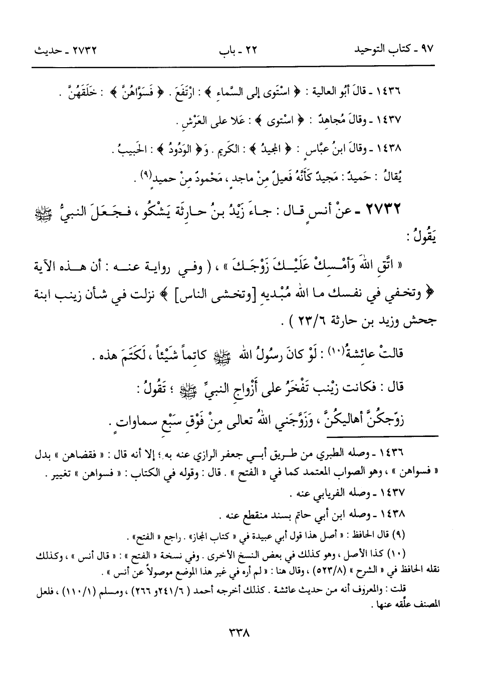 "اتَّقِ اللهَ وَأمْسِكْ عَلَيْكَ زَوْجَكَ"، (وفي رواية عنه: أن هذه الآية {وَتُخْفِي فِي نَفْسِكَ مَا اللَّهُ مُبْدِيهِ [وتخشي الناس]} نزلت في شأن زينب ابنة جحش وزيد بن حارثة 6/ 23).