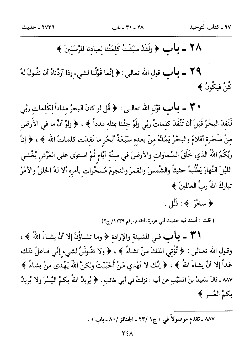 30 - باب قوْلِ الله تعالى: {قُلْ لَوْ كَانَ الْبَحْرُ مِدَادًا لِكَلِمَاتِ رَبِّي لَنَفِدَ الْبَحْرُ قَبْلَ أَنْ تَنْفَدَ كَلِمَاتُ رَبِّي وَلَوْ جِئْنَا بِمِثْلِهِ مَدَدًا}، {وَلَوْ أَنَّمَا فِي الْأَرْضِ مِنْ شَجَرَةٍ أَقْلَامٌ وَالْبَحْرُ يَمُدُّهُ مِنْ بَعْدِهِ سَبْعَةُ أَبْحُرٍ مَا نَفِدَتْ كَلِمَاتُ اللَّهِ إِنَّ اللَّهَ عَزِيزٌ حَكِيمٌ}، {إِنَّ رَبَّكُمُ اللَّهُ الَّذِي خَلَقَ السَّمَاوَاتِ وَالْأَرْضَ فِي سِتَّةِ أَيَّامٍ ثُمَّ اسْتَوَى عَلَى الْعَرْشِ يُغْشِي اللَّيْلَ النَّهَارَ يَطْلُبُهُ حَثِيثًا وَالشَّمْسَ وَالْقَمَرَ وَالنُّجُومَ مُسَخَّرَاتٍ بِأَمْرِهِ أَلَا لَهُ الْخَلْقُ وَالْأَمْرُ تَبَارَكَ اللَّهُ رَبُّ الْعَالَمِينَ}
