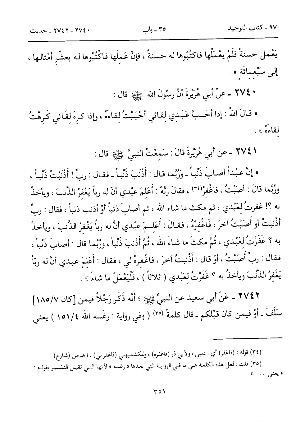 2741 - عن أبي هُرَيْرةَ قالَ: سَمِعْتُ النبيَّ - صلى الله عليه وسلم - قال: "إنَّ عبْداً أصابَ ذَنْباً -وَرُبَّما قال: أَذْنَبَ ذَنْباً- فقال: ربِّ! أَذْنَبْتُ ذَنْباً، ورُبَّما قالَ: أصَبْتُ، فاغْفِرْ (34)، فقالَ ربُّهُ: أَعَلِمَ عبْدي أنّ له رباً يَغْفِرُ الذَّنبَ، ويأخذُ به؟! غفرتُ لِعَبْدي، ثم مكث ما شاء الله، ثم أصابَ ذنباً أوْ أذنب ذنباً، فقال: ربِّ أذْنبتُ أو أَصَبْتُ آخرَ، فَاغْفِرْهُ، فقالَ: أَعَلِمَ عبْدي أنَّ له رباً يَغْفِرُ الذَّنبَ، ويأخذُ به؟ غَفَرْتُ لِعَبْدي، ثُمَّ مكثَ ما شاءَ الله، ثُمَّ أَذْنبَ ذَنْباً، ورُبَّما قال: أصابَ ذَنْباً، فقال: ربِّ أَصَبْتُ، أوْ قال: أَذْنبتُ آخرَ، فاغْفِرهُ لي، فقال: أَعَلِمَ عبدي أنَّ له ربًّا يَغْفِرُ الذَّنبَ ويأخذُ به؟ غَفَرْتُ لِعَبْدي (ثلاثاً)، فَلْيَعْمَلْ ما شاءَ".