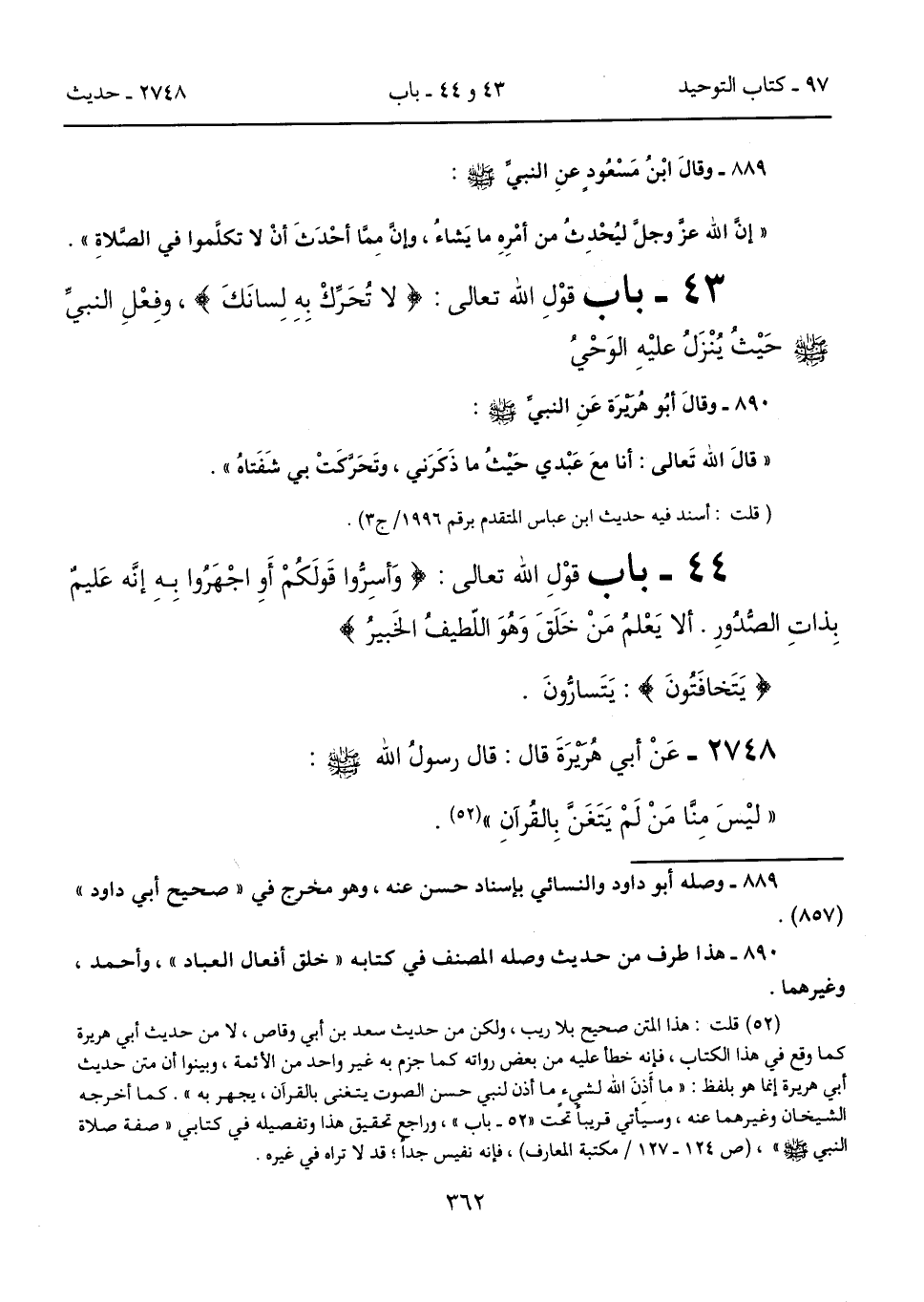 (52) قلت: هذا المتن صحيح بلا ريب، ولكن من حديث سعد بن أبي وقاص، لا من حديث أبي هريرة كما وقع في هذا الكتاب، فإنه خطأ عليه من بعض رواته كما جزم به غير واحد من الأئمة، وبينوا أن متن حديث أبي هريرة إنما هو بلفظ: "ما أَذنَ الله لشيءٍ ما أذن لنبي حسن الصوت يتغنى بالقرآن، يجهر به". كما أخرجه الشيخان وغيرهما عنه، وسيأتي قريبًا تحت "52 - باب"، وراجع تحقيق هذا وتفصيله في كتابي "صفة صلاة النبيّ - صلى الله عليه وسلم -"، (ص 124 - 127/ مكتبة المعارف)، فإنه نفيس جداً؛ قد لا تراه في غيره.