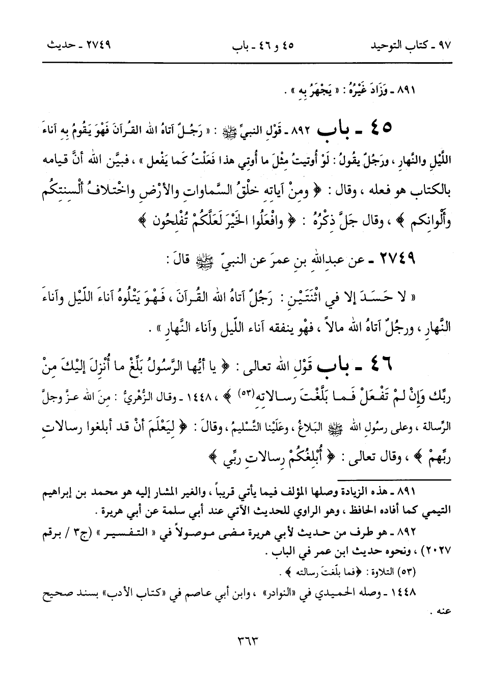 45 - باب 892 - قَوْلِ النبيِّ - صلى الله عليه وسلم -: "رَجُلٌ آتَاهُ اللَّهُ الْقُرْآنَ فَهْوَ يَقُومُ بِهِ آنَاءَ اللَّيْلِ وَالنَّهَارِ، وَرَجُلٌ يَقُولُ: لَوْ أُوتِيتُ مِثْلَ مَا أُوتِىَ هَذَا فَعَلْتُ كَمَا يَفْعَلُ"، فبيَّن الله أنَّ قيامه بالكتاب هو فعله، وقال: {وَمِنْ آيَاتِهِ خَلْقُ السَّمَاوَاتِ وَالْأَرْضِ وَاخْتِلَافُ أَلْسِنَتِكُمْ وَأَلْوَانِكُمْ}، وقال جَلَّ ذِكْرُهُ: {وَافْعَلُوا الْخَيْرَ لَعَلَّكُمْ تُفْلِحُونَ}