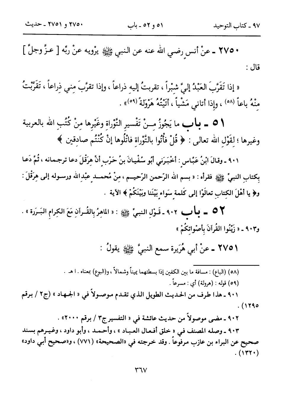 "إذا تَقَرَّبَ العَبْدُ إليَّ شِبْراً، تقربتُ إليهِ ذراعاً، وإذا تقرَّبَ مِني ذِراعاً، تَقَرَّبْتُ مِنْهُ باعاً (85)، وإِذا أتاني مَشْياً، أتَيْتُهُ هَرْولةً (59) ".