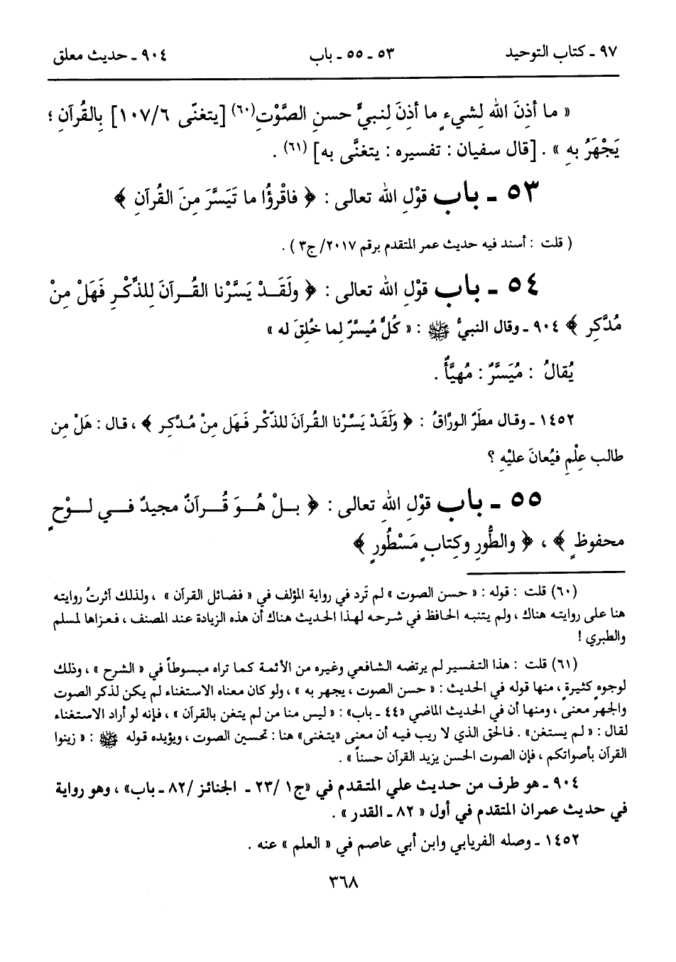 (60) قلت: قوله: "حسن الصوت" لم تَرد في رواية المؤلف في "فضائل القرآن"، ولذلك أثرتُ روايته هنا على روايته هناك، ولم يتنبه الحافظ في شرحه لهذا الحديث هناك أن هذه الزيادة عند المصنف، فعزاها لمسلم والطبري!
