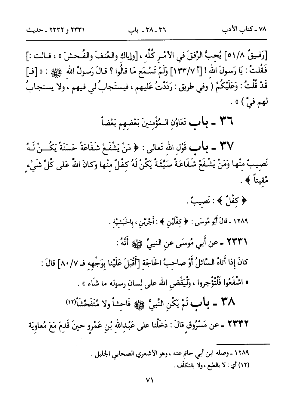 37 - بابُ قَوْلِ اللهِ تَعالى: (مَنْ يَشْفَعْ شَفَاعَةً حَسَنَةً يَكُنْ لَهُ نَصِيبٌ مِنْهَا وَمَنْ يَشْفَعْ شَفَاعَةً سَيِّئَةً يَكُنْ لَهُ كِفْلٌ مِنْهَا وَكَانَ اللَّهُ عَلَى كُلِّ شَيْءٍ مُقِيتًا).