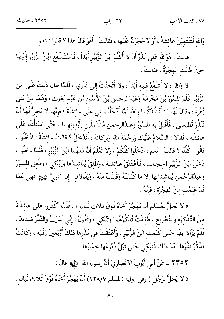 "لا يَحِلُّ لِمُسْلِمٍ أَنْ يَهْجُرَ أَخاهُ فَوْقَ ثلاثِ لَيالٍ"، فَلَمَّا أَكْثَروا عَلى عائِشَةَ مِنَ التَّذْكِرَةِ وَالتَّحْريجِ، طَفِقَتْ تُذَكِّرُهُما وَتَبْكِي، وَتَقُولُ: إِنِّي نَذَرْتُ والنَّذْرُ شَديدٌ، فَلَمْ يَزَالا بِهَا حَتَّى كَلَّمَتِ ابْنَ الزُّبَيْر، وَأَعْتَقَتْ في نَذْرِها ذلكَ أَرْبَعينَ رَقَبَةً، وَكَانَتْ تَذْكُرُ نَذْرَها بَعْدَ ذلك فَتَبْكِي حَتى تَبُلَّ دُمُوعُها خِمَارَها.