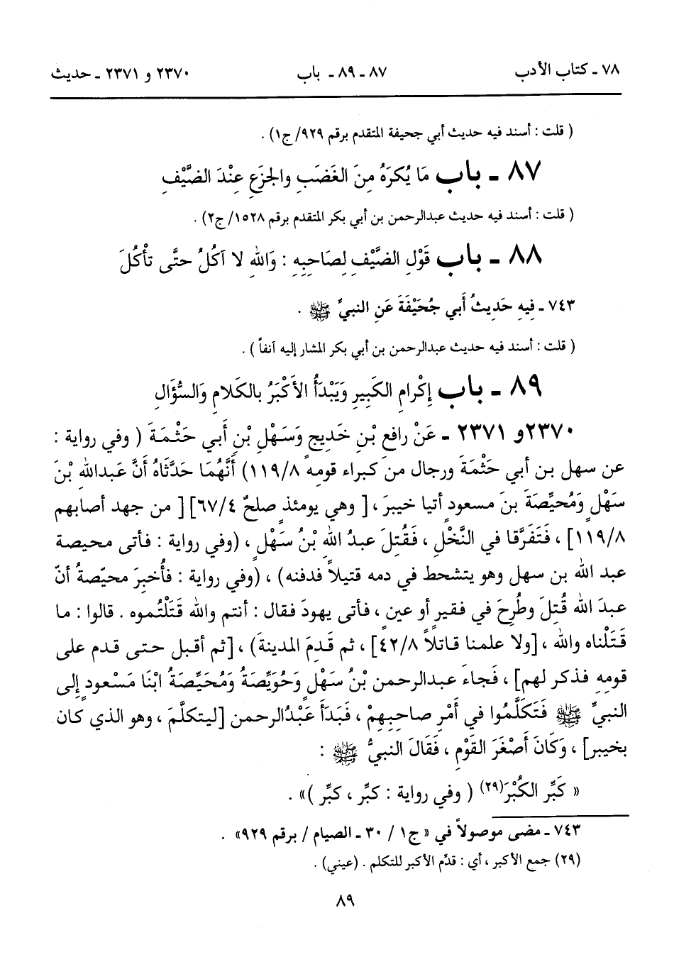 89 - باب إِكْرامِ الكَبِيرِ وَيَبْدَأُ الأَكْبَرُ بالكَلامِ وَالسُّؤَالِ