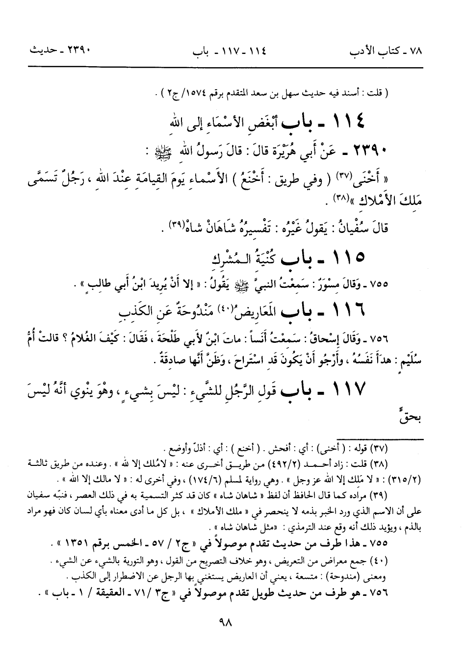 (39) مراده كما قال الحافظ أن لفظ "شاهان شاه" كان قد كثر التسمية به في ذلك العصر، فنبّه سفيان على أن الاسم الذي ورد الخبر بذمه لا ينحصر في "ملك الأملاك"، بل كل ما أدى معناه بأي لسان كان فهو مراد بالذم، ويؤيد ذلك أنه وقع عند الترمذي: "مثل شاهان شاه".