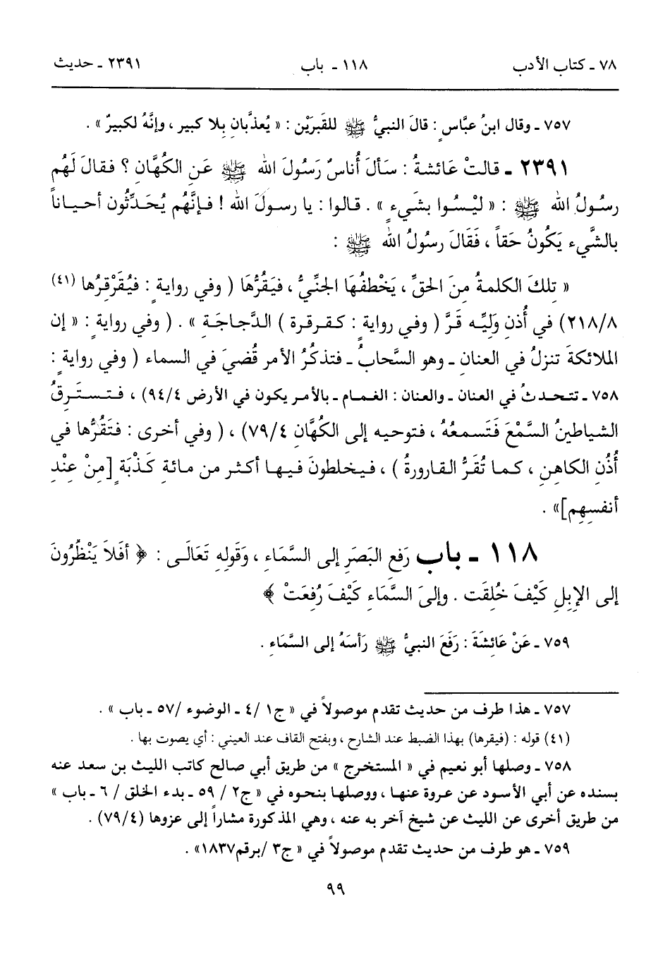 118 - باب رَفعِ البَصَرِ إلى السَّمَاءِ، وَقَولِهِ تَعَالَى: (أفَلاَ يَنْظرُونَ إلى الإِبِلِ كَيْفَ خُلِقَت * وإلىَ السَّمَاءِ كَيْفَ رُفِعَتْ)