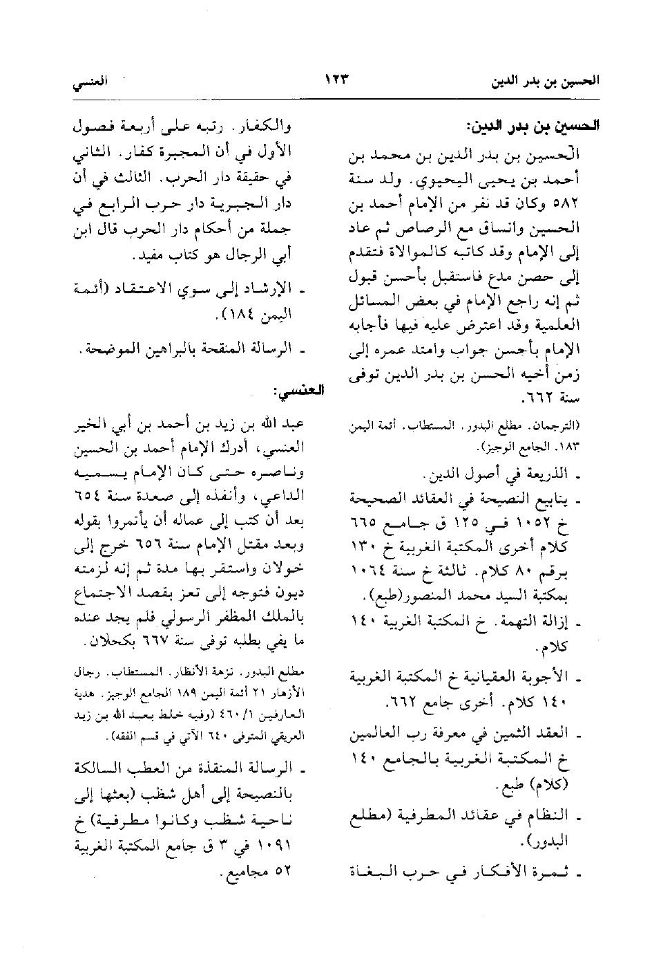 - العقد الثمين في معرفة رب العالمين خ المكتبة الغربية بالجامع 140 كلام طبع . النظام في عقائد المطرفية مطلع البدور.