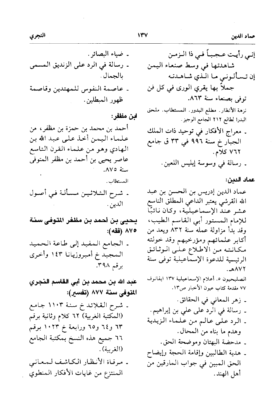- عماد الدين إدريس بن الحسن بن عبد الله القرشي يعتبر الداعي المطلق التاسع عشر عند الإسماعيلية وكان نائباً للإمام المستور أبي القاسم الطيب وقد بدأ مزاولة عمله سنة 832 ويعد من اكابر علمائهم ومؤرخيهم وقد خولته مكانته من الاطلاع على الوثائق الرئيسية للدعوة الإسماعيلية توفي سنة 872هـ . زهر المعاني في الحقائق. رسالة في الرد على علي بن إبراهيم . الرد على عالم من علماء الزيدية وهدم ما بناه من المحال. مدحضة البهتان وموضحة الحق . هدية الطالبين وإقامة الحجة وإيضاح الحق المبين في جواب المارقين من اهل الهند.