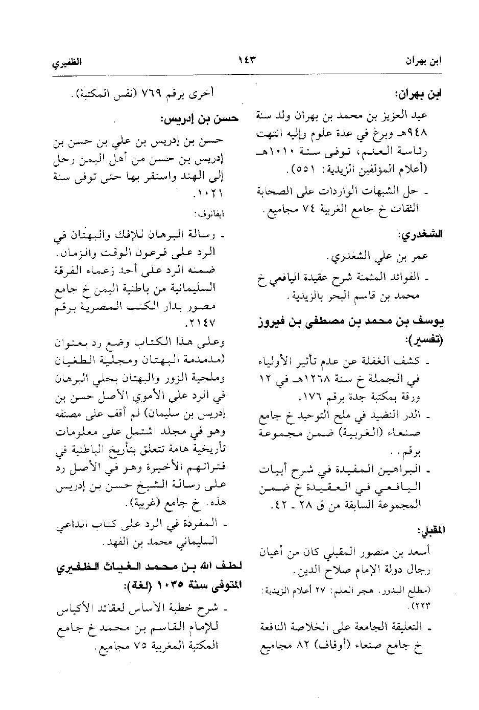 - عبد العزيز بن محمد بن بهران ولد سنة 948هـ وبرغ في عدة علوم وإليه انتهت رئاسة العلم توفي سنة 1010هـ أعلام المؤلفين الزيدية 551.